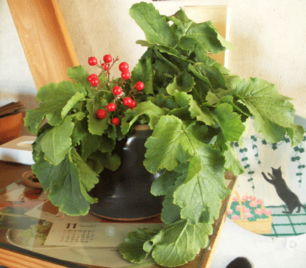 フレッシュ大根、葉っぱの弾ける青さに思わず赤い実さして作っちった、新飾りの元気玉!