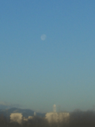 寒い一日でしたね。でも、これぞ清々しい、いかにもの冬!心身引きしまります。氷のカケラみたいな朝の月です。溶けかかったまま、空にはりついています。そして、夕方の空です。