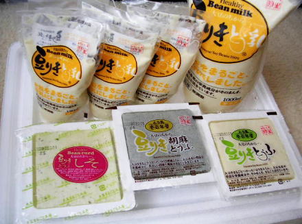 さっき届いたばかりの豆腐のセット公開!大豆まるごと工房さんのお試しセット画像めちゃめちゃ悪っ。これ先日のお買い物マラソンで1,000円で買ったんですよ。(通常は2,000円のもの)なんと箱の中には氷がたくさん♪まるで鮮魚が来たのかと思いました。笑氷たくさんの中から出てきたのは・・・お豆腐3種・豆乳180ml×3・豆乳1,000ml×1・抹茶塩1パックそれに・・・・・↑↑↑一回分ずつ小分けされた「にがり」も入ってました。なんだかすごく得した気分のセットなのですが、正直、HPを見る限りではどんな豆腐なのか・・・どんなところにこだわっているのか・・・いまひとつわからないのです。届いた中にあった説明を読んでやっとわかりました。なんとこちらの豆腐・・・おからを出さない豆腐おからを出さない独自の製法を使ったまるごと大豆の豆腐なのでした。すごい・・・そんな豆腐はじめてかも♪一般のものと比べると3倍の食物繊維、1.2倍のカルシウムを摂れると。そして↑のにがりの使い方もちゃんと書いてある紙も入ってます。豆乳小さい方はそのまま飲んで、大きな方は手作り豆腐を楽しもうかなーーっ。ちなみにワタシ最近、木綿豆腐を塩で食べるのに嵌ってまして、ものすごく美味しいんですよ。今回ついていた抹茶塩もすごく楽しみなんですがっ!!食べた感想はまた後日♪大豆まるごと工房1個目の日記はパン!