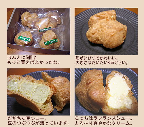 またまた届いてしまいました。今回届いたのはやまがた特産屋さんのシュークリームです!わりとしっかりとしたシュー皮。そして隙間無くつまっているクリームにちょっと感動を覚えましたよ。どちらも美味しかったけど、特にラフランスのさわやかなクリームが気に入りました。口にいれると香るラフランスの香り。この時期にイイ感じです♪だだちゃもラフランスも甘さが控えめです。今回は送料無料の共同購入で購入しました。通常は10個入りになります。(送料別)ラフランス シュークリーム だだちゃ豆シュークリーム* * * * * * * * * * * * * * * * * * * * * * * * *ひとこと日記楽天さん。高機能エディタもいいけれど、書いたものが消えないような機能をつけてはくれぬか。* * * * * * * * * * * * * * * * * * * * * * * * *今日の気になる!焼きじゃが20袋!送料込2,600円家庭用佐藤錦500グラム送料込1,900円横浜開港150周年記念!送料込1,500円