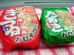 お暑うございます。今日のブランチはファミマにておにぎし。なんだかとっても面白いものが出たって言うので買い物ついでに寄ってみました。買ったのはコイツらです。⇒赤いきつねと緑のたぬきのおにぎり1個128円。きゃーこういうの大好き。売れてるみたいで昼前に行ったのにもうすでに1個ずつしか残ってなかったのよ!ギリギリセーフよ!すぐに食べたいので車内撮影。 表と裏を撮ってみたけど・・・。ご飯には赤いきつねのカップめんのスープを再現し、炊き込んでいるらしい。ほんと!そんな感じの味。お出汁と甘めのおしょうゆ味のおにぎり。炒り卵みたいなものと小さくきったかまぼこが混ぜ込んであって若干チャーハンっぽいの。ちょっと汁を含んだ感じのお揚げと一緒に食べるとなかなかイイっこっちは緑のたぬき♪かき揚げには海老がたくさん入ってた。とろりとしたあんのようなタレがかかって甘めな天むすみたい。どっちも食べてみて・・ワタシはあげの方が好き。ファミマって楽しいなあ。無印良品の黒バウムなんつーのも買ってみたの。ポチっとお願いします。シロクロ