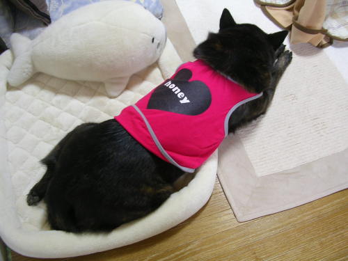 昼過ぎたとたんになんとなく全体に雲が広がってきてんーやはり予報通り天気は下っているのね・・・などと少々がっかりしながら早めの散歩に繰り出しました。ちょいと離れた公園まで車で行ったものですから帰りにローソンなんぞに寄りつつ帰宅。 もー寝ちゃいますよ伸びてますな・・・。散歩から帰ったら即「トリーツ食べたい」クロスケなのです。だからワタシのことをこうして待っているのです。アナタは足を洗われたあとはすぐにお部屋に入って暇なのでしょうが飼い主はいろいろと後始末があって(ウンを流したり、片付けたり、着替えたり)そうそうすぐには部屋に戻れないのですもん。おやつっ! プレミアム桜と小倉クリームのロールケーキ少し塩気のある桜スポンジにふんわりとろっの小豆クリームはやさしい甘さ。今・・100円だっていうんでLチキも。ちょい組み合わせ悪くて若干胸焼けっていう話はスルーでお願いします。