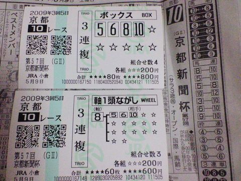 「第31回 新潟大賞典」 レース結果 大外れ! 藤田騎手騎乗の5番人気シンゲン(牡6、美浦・戸田)が重賞初制覇を飾った。勝ち時計は1分56秒9。道中は中団待機。直線半ばで馬群を割って突き抜け2着に3馬身差をつけて快勝した。2着は16番人気のニホンピロレガーロ、3着は2番人気のオペラブラーボで3連単は45万円の高額配当になる波乱となった。なお、1番人気のオースミグラスワンは降着により10着となった。 馬連(6)(9)は2万9470円、86番人気馬単(9)(6)は4万7940円、153番人気3連複(6)(8)(9)は5万9520円、209番人気3連単(9)(6)(8)は45万3690円。1386番人気(注=成績、払戻金などは必ず主催者発行のものと照合して下さい) 私の予想 残念ながら外れ◎ オースミグラスワン (2枠4番 川島騎手 )1番人気 3.9倍 10着 〇 ダイシングロウ (5枠10番 藤岡騎手 ) 7番人気 10.0倍 7着 ▲ アーネストリー (7枠13番 佐藤騎手 ) 4番人気 7.6倍 5着 △サクラオリオン (6枠12番 秋山騎手 ) 12番人気 41.7倍 13着 件数場名レース式別馬組金額(1)新潟(土)11R3連単 04→10→12200円 (2)新潟(土)11R3連単 04→10→13200円 (3)新潟(土)11R3連単 04→12→10100円 (4)新潟(土)11R3連単 04→12→13100円 (5)新潟(土)11R3連単 04→13→10200円 (6)新潟(土)11R3連単 04→13→12100円 (7)新潟(土)11R3連単 10→04→12100円 (8)新潟(土)11R3連単 10→04→13200円 (9)新潟(土)11R3連単 10→12→04100円 (10)新潟(土)11R3連単 10→12→13100円 (11)新潟(土)11R3連単 10→13→04200円 (12)新潟(土)11R3連単 10→13→12100円 合計 1,700円 不幸中の幸いは、京都新聞杯が当たったことだ。(本命サイド) 単勝1番人気に推されたベストメンバー(牡3、栗東・宮本)が差し切り、2分13秒0のタイムで重賞初勝利を飾った。賞金を上積みし、ダービー出走は確実となった。2着は武豊騎乗のデルフォイ(3番人気)。3着はロードロックスター(4番人気)。 道中は中団で脚をタメると直線向いてスパート。逃げ粘るロードロックスターを交わすと、外から迫ってきたデルフォイの追撃を半馬身抑えてゴールした。皐月賞は5着でダービーの優先出走権を逃したが、この勝利で賞金を加算してダービー出走がかなった。騎乗した四位騎手は「強気に乗って、それがいい方向に出た。ここで勝ち負けしないとダービーに出れなかったし、皐月賞も一発勝負で権利を取った。運がありますね」と話した。 馬連(5)(8)900円、2番人気馬単(8)(5)1640円、3番人気、 3連複(5)(6)(8)2840円 6番人気 3連単(8)(5)(6)1万560円。15番人気 (注=成績、払戻金などは必ず主催者発行のものと照合してください) ブログランキングに参加しています。記事にビビっときたらワンクリックお願いします!♪ にほんブログ村!!アダルトトラックバックやコメントはやめてください!!
