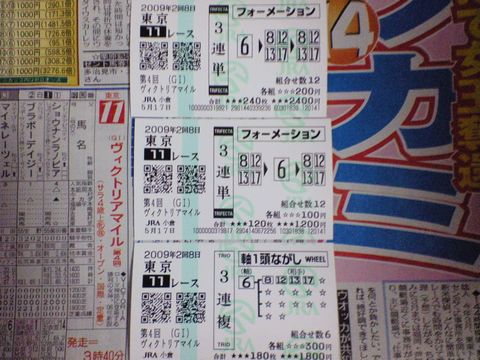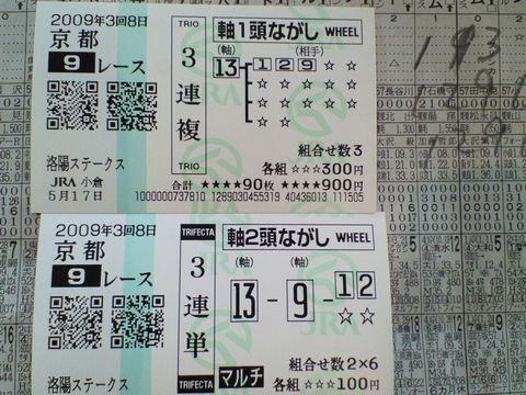 先日の3回京都8日目9Rで予想を検討していた段階では3連単フォーメーションであったが、 気が変り3連単マルチで1番人気・2番人気からとし外れた。 配当は3連複 1-2-13 3040円 5番人気 3連単 1-2-13 18690円 33番人気ブログランキングに参加しています。記事にビビっときたらワンクリックお願いします!♪にほんブログ村!!アダルトトラックバックやコメントはやめてください!!