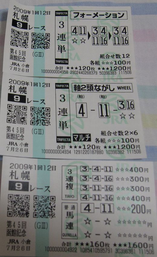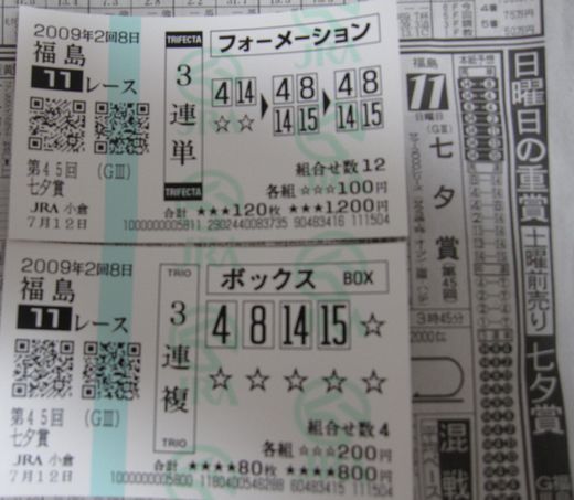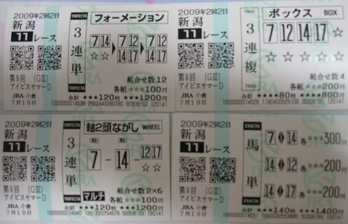 (第9回 アイビスサマーダッシュ) 私の予想は外れ 昨年のサマースプリント覇者カノヤザクラ(牝5、栗東・橋口)が好位からゴール前で力強く伸び、連覇を飾った。重馬場で時計は56秒2。小牧騎手は「去年よりスタートが一段と良かった。早めには行きたくないと思っていたが、あれだけ速ければ楽勝しても不思議はない」と発馬を勝因の1つに挙げた。2着には外ラチ沿いを強襲したアポロドルチェが入り、アルティマトゥーレが3着。外枠が強いレースの傾向通り、ピンクの帽子のワンツーとなった。1番人気エイシンタイガーは5着に終わった。 馬連(17)(18)4150円、 17番人気馬単(17)(18)7780円、 29番人気3連複(12)(17)(18)9460円、 27番人気3連単(17)(18)(12)6万7570円。 196番人気 小牧騎手は土曜日は小倉で騎乗、カノヤザクラのため新潟へ ◎ エイシンタイガー (7枠14番 内田騎手)1番人気 4.1倍 5着 〇 シャウトライン (4枠7番 吉田隼人騎手)4番人気 8.2倍 9着 ▲ アルティマトゥーレ (6枠12番 松岡騎手)2番人気 4.4倍 3着 △ カノヤザクラ(8枠17番 小牧騎手)3番人気 7.5倍 1着 × コスモベル (7枠15番 佐藤騎手)5番人気 8.6倍 8着 前日購入 今日は、開門時間の30分前に競馬場前で待機し席取を行ったが、結局前売りを買って競馬場では1レースも見なかった。早めに映画を見に行く予定が奥さんの都合で出かける時間が遅くなり、映画を見ずに小倉祇園祭りを2時間見ていた。 今日の当たり馬券で若干プラスとなった。 3連単14-15-5 10830円 3連複 4-9-12 2390円 間違って2枚同じものを購入 ブログランキングに参加しています。記事にビビっときたらワンクリックお願いします!♪ にほんブログ村!!アダルトトラックバックやコメントはやめてください!!