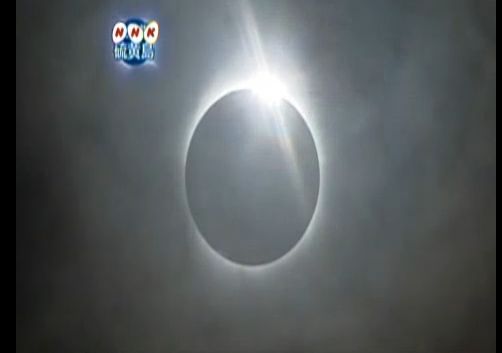 ネットサーフィンより取り込んだ画像。 ソフトはWoopie Desk Topにて NHKの硫黄島での皆既日食。 ダイヤモンドリング (皆既日食の際、その前後の一瞬の間、 月の影から太陽の光が一か所だけから漏れ出て輝くこと。) コロナ プロミネンス (太陽の縁から巨大な炎が燃え上がるように見えることがあります。これはプロミネンスとよばれる水素ガスの雲で、ときには空中に何ヶ月もういています。プロミネンスは黒点の周囲にあらわれたり、黒点などの活動領域からはなれたところにあらわれたりもします。) ダイヤモンドリング (皆既日食の際、その前後の一瞬の間、 月の影から太陽の光が一か所だけから漏れ出て輝くこと。) 地平線の周りが明るくなる 次に見れるのは、来年 チリのイースター島 日本では26年後ブログランキングに参加しています。記事にビビっときたらワンクリックお願いします!♪ ブログランキングに参加しています。記事にビビっときたらワンクリックお願いします!♪ にほんブログ村!!アダルトトラックバックやコメントはやめてください!!