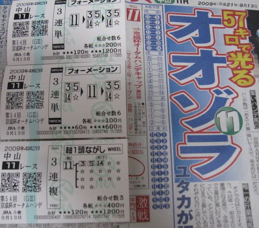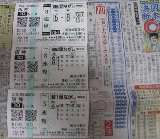 第27回 関西テレビ放送賞 ローズステークス の傾向 近年は春のクラシック出走馬が優勢! ダート経験馬は割引き!? ラヴェリータ を下げる 武豊・安藤勝己・福永祐一騎手に注目!:武豊騎手と福永騎手を中心に 第27回 関西テレビ放送賞 ローズステークス 私の予想<1> ◎ ジェルミナル (4枠8番 福永騎手)4番人気 13.6倍 〇 ミクロコスモス (5枠9番 武豊騎手)2番人気 9.2倍 ▲ レッドディザイア (6枠11番 四位騎手)1番人気 1.3倍 実績は断トツだが天の邪鬼予想で3番手 ニッカンスポーツの予想人は、オカダさんを除き全員 レッドディザイア 本命 △ ワイドサファイア (2枠3番 岩田騎手)3番人気 13.1倍 買い目 3連単 8,9-3,8,9,11-3,8,9,11 3,8,9-11-3,8,9 3,8,9-3,8,9-11 各100円 又も外れ馬券となるかな? 抑えに11-3,8-3,8 各300円 追加 ----オークス惨敗-- 牝馬クラシック第2弾・オークス レース結果(外れ)<オークス>◇24日=東京◇G1◇芝2400メートル◇3歳牝◇出走18頭(ワイドサファイアは競走除外) 1番人気のブエナビスタ(栗東・松田博)が激戦を制し、 桜花賞に続いて2冠を達成した。 道中は後方でうまく折り合い、安藤勝騎手に導かれ4コーナーで外に持ち出すと、 先に抜け出したレッドディザイアを急追。 ファンが届かないだろうと息をのんで見守る中、 飛ぶような豪脚でゴール前できっちり鼻差かわし勝利した。 安藤勝騎手は「負けてなくてよかった。4コーナーで内か外か迷い、 仕掛けが遅れた。馬に助けられました。 ホッとしました。よかったなあ」と笑顔で話した。 3着にジェルミナルが入り、 ワンツースリーは桜花賞と同じ着順となった。 払戻金は馬連(3)(7)は320円、1番人気馬単(7)(3)は440円、1番人気3連複(3)(7)(14)は1250円、2番人気3連単(7)(3)(14)は2430円。2番人気 (注=成績、払戻金は必ず主催者発行のものと照合して下さい) ◎:ディアジーナ (4枠8番 内田騎手)3番人気 9.3倍 5着 〇:ブエナビスタ (4枠7番 安藤騎手)1番人気 1.6倍 1着▲:レッドディザイア (2枠3番 四位騎手)2番人気 6.7倍 2着 △:ブロードストリート (7枠13番 藤田騎手)7番人気 30.1倍 4着 △:ワイドサファイア (8枠16番 岩田騎手)12番人気 47.1倍 未出走 3連単 7,8-7,8-3,13,16 x300円 3連単 7,8-3,13,16-7,8 x200円 3連単 3,13,16-7,8-7,8 x100円 ブログランキングに参加しています。記事にビビっときたらワンクリックお願いします!♪ にほんブログ村!!アダルトトラックバックやコメントはやめてください!!