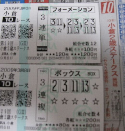 2歳重賞! 「第29回 小倉2歳ステークス」私の予想は外れ 単勝2番人気ジュエルオブナイル(牝、栗東・荒川)が混戦を制した。 道中は3番手と絶好のポジションを確保。 直線で外に持ち出されるとしぶとく伸び、 ダッシャーゴーゴー(5番人気 12.6倍)の追い込みを封じて 首差の勝利を収めた。 勝ち時計は1分9秒0。 鮫島騎手は「初めて乗ったが(前2走で騎乗した)川田騎手から チャンスのある馬だと聞いていた。 まだ外にもたれたり若いところはあるが、力で押し切ってくれた」と称賛した。 3着にオレンジティアラが入り、 外枠発走となった1番人気サリエルは4着同着。 外枠発走になった時点でがっくりした! 4着同着 サリエル(福永騎手)「潜ってしまいましたね。ちょっとイライラしていて、ゲートの中でグイッとやられてどうしようもありませんでした.いいところは見せてくれましたけど、もう少し中に入れたかったですね」 馬連(13)(14)は2900円、 13番人気馬単(13)(14)は4650円、 18番人気3連複(2)(13)(14)は8670円、31番人気3連単(13)(14)(2)は4万2450円。127番人気 本命サイドへ ◎ サリエル (6枠11番 福永騎手)1番人気 3.6倍:4着 〇 メイショウウズシオ (3枠4番 武 豊騎手)3番人気 5.2倍:13着 ▲ ジュエルオブナイト(7枠13番 鮫島騎手)2番人気 3.6倍:優勝 △ オレンジティアラ(2枠 2番 小牧騎手)4番人気 8.2倍:3着 小倉のリーディング争いが熾烈である。 前日まで福永騎手が20勝 武騎手18勝であったが、 武騎手は1R・4Rで1番人気の馬で2勝し、追いついた。 また、3Rは2着の2番が降着となり、2着となった。 私もラッキーで当たった。 私は、今日は武騎手を応援する馬券を絡めて予定。 ブログランキングに参加しています。記事にビビっときたらワンクリックお願いします!♪ にほんブログ村!!アダルトトラックバックやコメントはやめてください!!