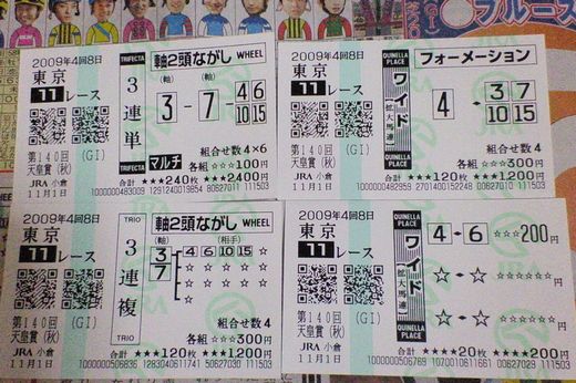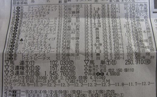 第34回エリザベス女王杯 私の馬券は紙くずに! 大逃げを打ったクィーンスプマンテが優勝する大波乱のレースとなりました。 2着は日経新春杯で大逃げで優勝したテイエムプリキュアが入り、大本命のブエナビスタを意識した後続馬は 金縛りにあったようなとんでもない展開となり 3連単が154万円との高額配当になりました。 ブエナビスタの1頭軸は堅かったのですが、逃げ残りは考慮しておらず 当然外れました。 クィーンスプマンテ関係者のコメント(日刊スポーツ紙面より) 840万円で購入された馬の大活躍! 1枠 1番 ウェディングフジコ(5歳) 56 菊沢隆徳 1枠 2番 メイショウベルーガ(4歳) 56 池添謙一 2枠 3番 チェレブリタ(4歳) 54 岩田康誠△ 2枠 4番 ジェルミナル(3歳) 54 福永祐一 21.0倍 13着〇 3枠 5番 リトルアマポーラ(4歳) 56 C.スミヨン 12.1倍 7着 3枠 6番 ピエナビーナス(5歳) 56 古川吉洋 4枠 7番 クィーンスプマンテ(5歳) 56 田中博康 77.1倍 優勝 4枠 8番 カワカミプリンセス(6歳) 56 横山典弘 15.1倍 5枠 9番 ブラボーデイジー(4歳) 56 生野賢一▲ 5枠10番 シャラナヤ(3歳) 54 C.ルメール 10.4倍 4着 6枠11番 テイエムプリキュア(6歳) 56 熊沢重文 91.6倍 2着△ 6枠12番 ブロードストリート(3歳) 54 藤田伸二 19.6倍 6着 7枠13番 サンレイジャスパー(7歳) 56 難波剛健 7枠14番 ニシノブルームーン(5歳) 56 北村宏司 7枠15番 ミクロコスモス(3歳) 54 武豊◎ 8枠16番 ブエナビスタ(3歳) 54 安藤勝己 1.6倍 3着 8枠17番 ムードインディゴ(4歳) 56 田中勝春 8枠17番 ムードインディゴ(4歳) 56 田中勝春 8枠18番 レインダンス(5歳) 56 藤岡康太 投票内容 件数 場名 レース 式別 馬組 金額 (1) 京都(日) 11R 3連単 16→04→05 300円 (2) 京都(日) 11R 3連単 16→10→05 300円 (3) 京都(日) 11R 3連単 16→12→05 300円 (4) 京都(日) 11R 3連単 16→05→04 300円 (5) 京都(日) 11R 3連単 16→05→10 300円 (6) 京都(日) 11R 3連単 16→05→12 300円 (7) 京都(日) 11R 3連単 05→16→04 200円 (8) 京都(日) 11R 3連単 05→16→10 200円 (9) 京都(日) 11R 3連単 05→16→12 200円 (10) 京都(日) 11R 3連単 04→16→05 200円 (11) 京都(日) 11R 3連単 10→16→05 200円 (12) 京都(日) 11R 3連単 12→16→05 200円 (13) 京都(日) 11R 3連単 16→04→05 100円 (14) 京都(日) 11R 3連単 16→04→10 100円 (15) 京都(日) 11R 3連単 16→04→12 100円 (16) 京都(日) 11R 3連単 16→05→04 100円 (17) 京都(日) 11R 3連単 16→05→10 100円 (18) 京都(日) 11R 3連単 16→05→12 100円 (19) 京都(日) 11R 3連単 16→10→04 100円 (20) 京都(日) 11R 3連単 16→10→05 100円 (21) 京都(日) 11R 3連単 16→10→12 100円 (22) 京都(日) 11R 3連単 16→12→04 100円 (23) 京都(日) 11R 3連単 16→12→05 100円 (24) 京都(日) 11R 3連単 16→12→10 100円 3連複は16 1頭軸に(25) 京都(日) 11R 3連複 04-05-16 300円 (26) 京都(日) 11R 3連複 04-10-16 300円 (27) 京都(日) 11R 3連複 04-12-16 300円 (28) 京都(日) 11R 3連複 05-10-16 300円 (29) 京都(日) 11R 3連複 05-12-16 300円 (30) 京都(日) 11R 3連複 10-12-16 300円 合計 6,000 ブログランキングに参加しています。記事にビビっときたらワンクリックお願いします!♪ にほんブログ村!!アダルトトラックバックやコメントはやめてください!!