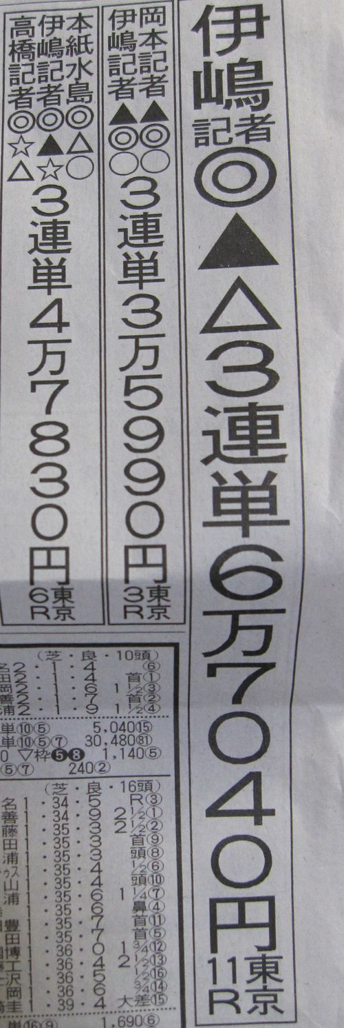 日刊スポーツの伊嶋記者大当たり 一昨日私が万馬券をゲットしたのと同じレースを伊嶋記者も大当たり。 私が当てたのは、東京3Rと11R 1年間に1回あるかないかの大当たり エリザベス女王杯も追加で大きく勝負したが外れてしまった。 東京3R レース結果 鼻差2着で3連単ゲット 2着のニーマルオトメから勝負であった。 東京11R レース結果 11番人気の4を絡めてゲットブログランキングに参加しています。 記事にビビっときたらワンクリックお願いします!♪ にほんブログ村!!アダルトトラックバックやコメントはやめてください!!