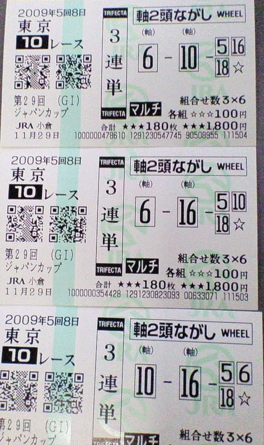 有馬記念はオウケンブルースリ! 衝撃のニュース! ウオッカは有馬記念出られず 日本中央競馬会(JRA)は29日、 ジャパンC(GI、芝2400メートル)を制したウオッカ(牝5歳、栗東・角居勝彦厩舎) が競走中に鼻出血を発症したと発表した。 ウオッカは規定により12月29日まで出走停止となり、 有馬記念(12月27日、中山競馬場、GI、芝2500メートル)に 出走できないことになった。(サンケイスポーツ)記事より 【ジャパンC】~私の予想は抑えが当たり! 好位から直線で抜け出した1番人気ウオッカ(牝5、栗東・角居)が、 大外から追い込んだ2番人気オウケンブルースリを鼻差抑え、 シンボリルドルフ、テイエムオペラオー、ディープインパクトに並ぶ7冠を達成した。 ルメール騎手は「最後は微妙な差で分からなかった。 道中は落ち着いてうまくリズムに乗れた。直線は行きたがったが、 彼女のパワーをためて乗った。素晴らしい馬」と絶賛した。 3着にはレッドディザイアが入り、外国馬最先着は4着のコンデュイット。馬連(5)(10)1020円、1番人気 馬単(5)(10)2020円、1番人気 3連複(5)(6)(10)2460円、5番人気 3連単(5)(10)(6)1万1690円。23番人気 2009 ジャpンカップ3連単マルチは抑えの6-10が当たり 2009 ジャpンカップ3連複は抑えの5-6-10が当たり 本命は外れ 今日から3連休、明日からの京都1泊2日の軍資金を稼ぎたい。! 本命 コンデュイット の相手馬は日本馬 勢いを買って、対抗馬はレッドディザイア 1枠 1番 アサクサキングス 518(+18) 1枠 2番 ネヴァブション (水曜・美浦)489(+15) 2枠 3番 エアシェイディ (水曜・美浦)498(+4) 2枠 4番 エイシンデピュティ (木曜・栗東)506(-4) △ 3枠 5番 ウオッカ ルメール 1番人気 3.6倍 優勝 〇 3枠 6番 レッドディザイア 四位 6番人気 9.6倍 3着 4枠 7番 ジャストアズウェル 490 ルパルー 4枠 8番 マイネルキッツ 508(+20) 松岡 5枠 9番 リーチザクラウン 516(+10) 武 ▲ 5枠10番 オウケンブルースリ 内田 2番人気 4.7倍 2着 6枠11番 マーシュサイド (木曜・東京)540 6枠12番 シンティロ (木曜・東京)454 7枠13番 ヤマニンキングリー (水曜・栗東)496(+16) 7枠14番 インティライミ (木曜・栗東)486(+6) 7枠15番 インターパテイション(木曜・東京)508 ◎ 8枠16番 コンデュイット ムーロ 3番人気 4.9倍 4着 ムーロ騎手でBCターフ(米国 G1 2400m)を2連覇 8枠17番 コスモバルク (木曜・門別)524(+20) △ 8枠18番 スクリーンヒーロー デムーロ 4番人気 7.5倍 13着 昨年は8枠16番 デムーロ騎乗で優勝 ----前回のブログ--- 「第29回 ジャパンカップ」 プレレーティング コンデュイット(愛) Conduit 牡 4 M.Stoute 125 L 英国 スクリーンヒーロー 牡 5 鹿戸 雄一 122 L ジャパンC1着(2008) ウオッカ 牝 5 角居 勝彦 120 M ヴィクトリアマイル1着 安田記念1着 オウケンブルースリ 牡 4 音無 秀孝 119 L ジャパンC5着(2008) ロジユニヴァース 牡 3 萩原 清 118 L 東京優駿1着 大本命のウオッカには、武 豊騎手が降板し、 ルメール騎手が騎乗! ますます人気がヒートアップしそう 国内有力馬と外国人騎手の組み合わせは相性が良い ブログランキングに参加しています。 記事にビビっときたらワンクリックお願いします!♪ にほんブログ村!!アダルトトラックバックやコメントはやめてください!!