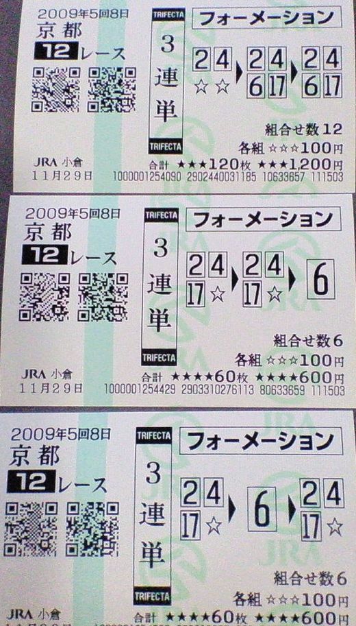 今日から1泊2日の京都小旅行 始発の電車で出かけます。 昨日の京都の最終レースでしっかり稼げた。 穴で選んだ6番「ニホンピロシェリー:7番人気 19.7倍」が3着 4-17-6 27,920円 200円ゲット 55,840円 4-6-17 3連複 6990円 12番人気 x500円 34,950円 ワイド (4-6 1870円 6-17 1390円)x600円 この軍資金で懐が豊かなので、京都で美味しいものを 食べたいと思う次第です。 また、今週のジャパンカップダートを連勝したいと 思い清水寺ではお賽銭を奮発したい。 ブログランキングに参加しています。 記事にビビっときたらワンクリックお願いします!♪ にほんブログ村!!アダルトトラックバックやコメントはやめてください!!