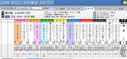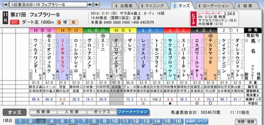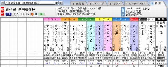 「第27回 フェブラリーステークス」 私の馬券 当たり 今年初めて推奨馬券が当たった! 単勝1・7倍の大本命エスポワールシチー(牡5、栗東・安達)が佐藤哲三騎手に導かれて2番手から直線で楽に抜け出し、G1・4連勝を飾った。ジョッキーが課題に挙げたスタートの芝部分を難なくクリア。逃げたローレルゲレイロの直後を追走して直線残り400メートルで先頭に立ち、押し切った。佐藤哲は「また強くなっている。芝の部分で悩んでいたが、終わってみれば簡単に行けたかな。(ドバイは)正式に決まればチャレンジしたい」とドバイWC(G1、3月27日=メイダン)参戦に強い意欲を見せた。2馬身半差の2着にテスタマッタ、3着にサクセスブロッケンが入った。 馬連(3)(4)890円、 3番人気馬単(4)(3)1190円、 4番人気3連複(3)(4)(6)1160円、2番人気3連単(4)(3)(6)4190円。4番人気 ◎ エスポワールシチー (2枠4番 佐藤騎手)1番人気 1.7倍 優勝〇 テスタマッタ (2枠3番 岩田騎手)5番人気 13.0倍 2着▲ サクセスブロッケン(3枠6番 内田騎手)2番人気 6.4倍 3着△ レッドスパーダ (4枠 8番 横山騎手)3番人気 9.2倍 12着△ リーチザクラウン (7枠14番 武豊騎手)4番人気 9.5倍 10着 01 東京 日 11R 3連複 03-04-06 200円 03-04-06 1,160円 2,320円 02 東京 日 11R 3連複 03-04-08 200円 - - 0円 03 東京 日 11R 3連複 03-04-14 200円 - - 0円 04 東京 日 11R 3連複 04-06-08 200円 - - 0円 05 東京 日 11R 3連複 04-06-14 200円 - - 0円 06 東京 日 11R 3連複 04-08-14 200円 - - 0円 07 東京 日 11R 3連単 04→03→06 200円 04→03→06 4,190円 8,380円 08 東京 日 11R 3連単 04→03→08 200円 - - 0円 09 東京 日 11R 3連単 04→03→14 200円 - - 0円 10 東京 日 11R 3連単 04→06→03 200円 - - 0円 11 東京 日 11R 3連単 04→08→03 200円 - - 0円 12 東京 日 11R 3連単 04→14→03 200円 - - 0円 13 東京 日 11R 3連単 03→04→06 200円 - - 0円 14 東京 日 11R 3連単 03→04→08 200円 - - 0円 15 東京 日 11R 3連単 03→04→14 200円 - - 0円 16 東京 日 11R 3連単 03→06→04 200円 - - 0円 17 東京 日 11R 3連単 03→08→04 200円 - - 0円 18 東京 日 11R 3連単 03→14→04 200円 - - 0円 19 東京 日 11R 馬連 03-04 500円 03-04 890円 4,450円 20 東京 日 11R 馬連 03-06 300円 - - 0円 21 東京 日 11R 馬連 03-08 300円 - - 0円 22 東京 日 11R 馬連 03-14 300円 - - 0円 トータル 5,000円 15,150円 ブログランキングに参加しています。 記事にビビっときたらワンクリックお願いします!♪ にほんブログ村!!アダルトトラックバックやコメントはやめてください!!