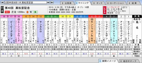 高松宮記念(GI) 私の予想はチョイあたり レース結果を仁和寺へ向かう途中短波ラジオで聞いた。 20100329 天龍寺の桜(am9:30撮影) ここは満開であった。 残念ながら3連複のみ当たった。 私の馬券01 中京 日 11R 3連複 03-06-13 300円 - - 0円 02 中京 日 11R 3連複 03-06-16 800円 - - 0円 03 中京 日 11R 3連複 03-06-17 300円 - - 0円 04 中京 日 11R 3連複 03-13-16 500円 - - 0円 05 中京 日 11R 3連複 03-13-17 300円 - - 0円 06 中京 日 11R 3連複 03-16-17 500円 - - 0円 07 中京 日 11R 3連複 06-13-16 500円 - - 0円 08 中京 日 11R 3連複 06-13-17 300円 - - 0円 09 中京 日 11R 3連複 06-16-17 500円 06-16-17 4,230円 21,150円 10 中京 日 11R 3連複 13-16-17 500円 - - 0円 11 中京 日 11R 3連単 16→03→06 300円 - - 0円 12 中京 日 11R 3連単 16→03→13 200円 - - 0円 13 中京 日 11R 3連単 16→03→17 200円 - - 0円 14 中京 日 11R 3連単 16→06→03 300円 - - 0円 15 中京 日 11R 3連単 16→06→13 300円 - - 0円 16 中京 日 11R 3連単 16→06→17 300円 - - 0円 17 中京 日 11R 3連単 16→13→03 200円 - - 0円 18 中京 日 11R 3連単 16→13→06 300円 - - 0円 19 中京 日 11R 3連単 16→13→17 200円 - - 0円 20 中京 日 11R 3連単 16→17→03 200円 - - 0円 21 中京 日 11R 3連単 16→17→06 300円 - - 0円 22 中京 日 11R 3連単 16→17→13 200円 - - 0円 23 中京 日 11R 3連単 03→16→06 100円 - - 0円 24 中京 日 11R 3連単 03→16→13 100円 - - 0円 25 中京 日 11R 3連単 03→16→17 100円 - - 0円 26 中京 日 11R 3連単 06→16→03 200円 - - 0円 27 中京 日 11R 3連単 06→16→13 200円 - - 0円 28 中京 日 11R 3連単 06→16→17 200円 - - 0円 29 中京 日 11R 3連単 13→16→03 100円 - - 0円 30 中京 日 11R 3連単 13→16→06 100円 - - 0円 31 中京 日 11R 3連単 13→16→17 100円 - - 0円 32 中京 日 11R 3連単 17→16→03 100円 - - 0円 33 中京 日 11R 3連単 17→16→06 100円 - - 0円 34 中京 日 11R 3連単 17→16→13 100円 - - 0円 トータル 9,000円 21,150円 はじめの予想を変えなければ3連単も当たっていたのに 2頭軸の3連単を止め、16番の1・2着に変えたのが敗因かな 自宅に戻ってJRAレーシングビュアでレースを見た。 なんで岩田騎手は下げたのかな? もう少し前で走っていればと感じた次第である。 ---前回のブログ-- このプログは京都第一ホテルのロビーのパソコンで記載している。 昨日見た桜では平野神社の桜が満開できれいであった。 仁和寺はまだつぼみで4月中旬が見ごろとのこと。 人気の両頭(6,3)が内枠のため、本命は外枠16へ 〇 キンシャサノキセキ(3枠6番 四位騎手)1番人気 3.9倍 優勝 高い潜在能力を評価されながら、激しい気性が常にネックとなり、GI 戦線で悔しい思いをしてきた馬。そこで起用されたのが、馬を抑え込むことに定評がある外国人騎手だった。C.スミヨン騎手が手綱を取って勝利したスワンSや、M.デムーロ騎手で快勝した阪神Cがこの馬の転機になったのか、四位洋文騎手が騎乗していた前走のオーシャンSでは、馬場の最内を鋭く伸びて差し切り勝ち、というひと皮向けたレース内容を披露した。充実一途の現在なら、悲願のGI 初制覇を期待してもいいはずだ。 ▲ アルティマトゥーレ(2枠3番 横山騎手)2番人気 4.3倍 GI 初挑戦で1番人気に支持された昨年のスプリンターズSは5着に敗退。ただし、そのレース内容はやや消極的な作戦が裏目に出てしまった印象を受けるもので、GI のステージでもその潜在能力は十分に通用するものを持っている。約2か月半ぶりだった前走のシルクロードSを完勝しているが、当時は先をにらんでの調整過程。前走からの上積みはかなり大きいはずで、2戦2勝の中京コースが舞台なら、GI 初制覇を決める大きなチャンスだ。 ◎ エーシンフォワード(8枠16番 岩田騎手)3番人気 6.1倍 3着 470キロ台の馬にしては線の細い印象だった馬が、昨秋あたりからずいぶんと馬体に厚みが出てきた。身体面の充実は成績にも表れ、昨年の暮れに1600万下の六甲アイランドS(阪神・芝1400m)、オープン特別の2009ファイナルS(阪神・芝1600m)を連勝。前走の阪急杯では好位追走から直線で馬場の内を突いて鋭く抜け出し、待望の重賞初制覇を決めている。ポイントは過去に一度しか走っていない芝1200mの距離だろう。激しい流れになりやすい小回りコースのスプリントレースに対応できれば、GI のタイトルが視界に入ってくる。 △ ビービーガルダン(8枠17番 安藤騎手)6番人気 11倍 2着 ローレルゲレイロとゴール前で激しい叩き合いを演じた昨年のスプリンターズS(2着)はいまだ記憶に新しい。前走の阪急杯では7着に敗れているが、これは勝負どころでハミが外れてしまったため。度外視できる一戦と言って良いだろう。むしろ、しっかりと乗り込んで好仕上がりに見えた馬体面には、好感が持てたほど。昨年の高松宮記念では、初めて経験する左回りコースに戸惑ったのか16着と大敗しているだけに、状態面よりも左回りを克服できるかどうかが大きな鍵となりそうだ。 カノヤザクラ(4枠7番 小牧騎手)9番人気 30.5倍 2年連続で『サマースプリントシリーズ』のチャンピオンに輝いた同馬は典型的な夏馬と言えるが、今年は例年のように冬毛がそれほど伸びておらず、いつものこの時季とは少し