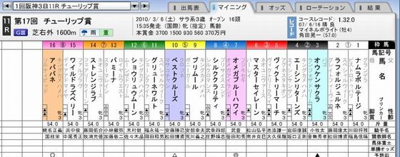 「第17回 チューリップ賞(桜花賞トライアル)」 私の予想は外れ<チューリップ賞>◇6日=阪神◇G3◇芝1600メートル ◇3歳牝◇出走16頭◇3着まで桜花賞優先出走権 何と2歳女王を押さえ込んだのはショウリュウムーン! 好位からラスト1Fで先頭に立った2歳女王アパパネ(美浦・国枝)に、 外から襲いかかったのが同じキングカメハメハ産駒の ショウリュウムーン(栗東・佐々木:9番人気)だった。 2着に4分の3馬身差をつけ、1分36秒1で快勝。 騎乗した公営園田の木村健騎手(34)はJRA重賞初制覇。 「人気馬の後ろで、折り合いだけ気をつけた。 直線の脚は素晴らしかったし、差し切ってくれて良かった」と喜びを語った。 同騎手は4日に地元園田の重賞を制覇、さらに12日に結婚式も控えており、 自ら華を添えた。2着はアパパネ、 3着にはエーシンリターンズ(栗東・坂口則)が入り、 桜花賞の優先出走権を手にした。 馬連(12)(16)は5980円、 22番人気馬単(12)(16)は1万5690円、51番人気3連複(4)(12)(16)は2万3510円、67番人気3連単(12)(16)(4)は18万6190円。446番人気本命には2戦2勝の オメガブルーハワイ ◎ オメガブルーハワイ (4枠7番 武 豊騎手)7番人気 14.5倍 14着乗り込み十分、馬体も完璧に仕上がっていたとはいえ、前走の500万下(京都・芝1400m)は、昨年11月のメイクデビュー東京(芝1400m、1着)以来となる約3か月ぶりの実戦だった。そのハンデをものともせずに勝ち切った同馬の能力は、想像以上のものがありそうだ。2戦2勝と負け知らずの成績で、初の重賞挑戦を迎える今回。一気の相手強化に加え、200mの距離延長と超えるべきハードルは高いが、優れた競馬センスを備えるこの馬なら克服も十分に可能だろう。 〇 アパパネ (8枠16番 蛯名騎手)1番人気 2.2倍 2着 2月18日に栗東トレーニング・センター入り。今回のレースだけでなく、本番の桜花賞まで約2か月の長い滞在になるが、昨年末にも同様の経験をしているだけあって、すでに環境に順応しているのは心強い。迫力満点の末脚が1番のセールスポイントだが、前走の阪神ジュベナイルフィリーズでは、大外18番枠をそつなくさばいた自在性も兼備している馬。好仕上がりでの復帰戦とあれば、好勝負を期待してもいいはずだ。 ▲ オウケンサクラ (2枠 3番 小牧騎手)2番人気 5.7倍 4着中1週の日程や強力な相手関係よりも、1600mの距離を優先して決められた今回の出走。「短い距離は走らせたくない。桜花賞の次のオークスまで考えている馬だし、このメンバーで権利を取ってこそ本番が楽しみになる」と、音無秀孝調教師は語っていた。出走を予定していたエルフィンSをフレグモーネで自重し、前走500万下のこぶし賞(京都・芝1600m、1着)は、やや追い足りない状態だった。だからこそ勝ち切った意味は大きく、また、前走を使った上積みもかなり見込めそうだ。 ヴィクトリーマーチ (3枠5番 池添騎手)前走のエルフィンS(京都・芝1600m)は2着に敗れたが、内外のコース取りの差が最後の半馬身差となった印象。メイクデビュー京都(芝1600m)を勝ち上がった直後の格上挑戦だったという背景を思えば、今後に向けてめどが立った一戦と言えるだろう。素質が一級品なのは間違いなく、桜花賞でも有力候補となる可能性を秘めた馬だが、まだ1勝馬の身というのが大きなネック。今回に関しては、是が非でも桜花賞の優先出走権獲得という結果が欲しいところだ。 ワイルドラズベリー (8枠 5番 池添騎手)レース間隔をあけながら使われてきている馬だが、デビューからの3戦すべてで高いパフォーマンスを見せてきた。特に中間の調教を強化し、マイナス4キロでも馬体はむしろたくましくなっていた前走の紅梅S(京都・芝1400m)は、直線で鞍上の浜中俊騎手が追い出しを待つほどの余裕がある勝ちっぷり。中尾秀正調教師も「こういう馬が大きいレースに行くんだね。夢が広がる内容だった」と、大きな手応えを感じているようだ。 △ ベストクルーズ (5枠10番 安藤騎手)4番人気 8倍 10着勝ち鞍は未勝利(京都・芝1600m)のわずか1勝ながら、ファンタジーS2着、阪神ジュベナイルフィリーズ3着と、レースのレベルが上がってもパフォーマンスが落ちない、超堅実派。しかし、同じ松田博資厩舎のタガノエリザベートと併せ馬をすれば、常に遅れてしまう"実戦タイプ"という背景もまた面白い。「こんな馬は珍しいよ。どこで力を入れるべきか、わかっているみたいだ」と、苦笑する松田博資調教師。今回も、大崩れすることなく上位争いに加わってくるだろう。 エーシンリターンズ 昨年暮れの未勝利(阪神・芝1800m)を快勝後、続く前走のエルフィンS(京都・芝1600m)ではヴィクトリーマーチの追撃を半馬身退け、2勝目をマーク。オープン特別を勝っての収得賞金の加算は、先を見据えた調整ができるという点でも、かなりのアドバンテージと言える。母エイシンサンサンは小倉3歳S(現小倉2歳S)の勝ち馬だが、息の長い活躍をした馬で、6歳(現5歳)時に2勝をマーク、エリザベス女王杯で3着に入るなど、現役後半期の方が成績は充実していた。馬体、走りと