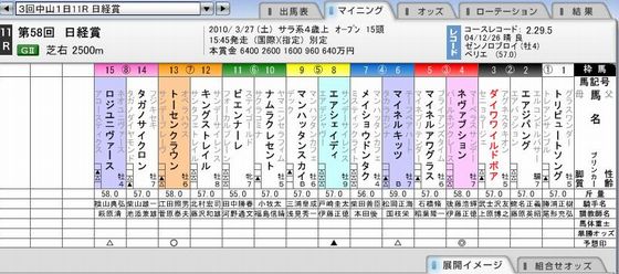 「第58回 阪神大賞典」 私の馬券は外れ 5番人気のトウカイトリック(牡8、栗東・野中)が07年ダイヤモンドS以来 3年ぶりの重賞制覇を果たした。 道中は中団を追走し、ジワジワ前との差をつめながら直線へ。 ゴール手前で力強く馬群を割って先頭に立つと、 外から食い下がったライバルたちを首差競り落としてゴールに飛び込んだ。 勝ちタイムは3分7秒3。初コンビの藤田騎手は「のんびりした馬で、 3000メートル追いっぱなし。道中はついていくのが精いっぱいでしたが、 最後までよく頑張ってくれました。次が楽しみですね」と天皇賞(春)を見据えた。 2着ジャミール、鼻差3着にメイショウベルーガ。 馬連(6)(13)1820円、 馬単(13)(6)4540円、3連複(6)(11)(13)2910円、3連単(13)(6)(11)2万1070円。 (注=成績、払戻金などは必ず主催者発行のものと照合してください)2010年3月21日16時16分(日刊スポーツ)古豪の復活はトウカイトリックであった。 件数 場名 レース 式別 馬組 金額 的中 (1) 阪神(日) 11R 3連単 01→11→13 100円 (2) 阪神(日) 11R 3連単 01→11→14 100円 (3) 阪神(日) 11R 3連単 01→13→11 100円 (4) 阪神(日) 11R 3連単 01→13→14 100円 (5) 阪神(日) 11R 3連単 01→14→11 100円 (6) 阪神(日) 11R 3連単 01→14→13 100円 (7) 阪神(日) 11R 3連単 14→01→11 100円 (8) 阪神(日) 11R 3連単 14→01→13 100円 (9) 阪神(日) 11R 3連単 14→11→01 100円 (10) 阪神(日) 11R 3連単 14→11→13 100円 (11) 阪神(日) 11R 3連単 14→13→01 100円 (12) 阪神(日) 11R 3連単 14→13→11 100円 (13) 阪神(日) 11R 3連単 14→01→11 100円 (14) 阪神(日) 11R 3連単 14→01→13 100円 (15) 阪神(日) 11R 3連単 14→11→01 100円 (16) 阪神(日) 11R 3連単 14→11→13 100円 (17) 阪神(日) 11R 3連単 14→13→01 100円 (18) 阪神(日) 11R 3連単 14→13→11 100円 (19) 阪神(日) 11R 3連単 01→14→11 200円 (20) 阪神(日) 11R 3連単 01→14→13 200円 (21) 阪神(日) 11R 3連単 11→14→01 200円 (22) 阪神(日) 11R 3連単 11→14→13 200円 (23) 阪神(日) 11R 3連単 13→14→01 200円 (24) 阪神(日) 11R 3連単 13→14→11 200円 (25) 阪神(日) 11R 3連複 01-11-13 500円 (26) 阪神(日) 11R 3連複 01-11-14 500円 (27) 阪神(日) 11R 3連複 01-13-14 500円 (28) 阪神(日) 11R 3連複 11-13-14 500円 購入金額 5,000円 払戻金額 0円 単勝上位人気馬が優勢!阪神大賞典では、単勝「1番人気」に支持された馬が圧倒的な好成績。また、「2番人気」の馬も3着内率70.0%という好成績となっている。ここ10年間でみると、単勝「1番人気」の馬と「2番人気」の馬でワンツーフィニッシュを決めたことが5回あるが、最近2年は単勝「1番人気」の馬が3着以下に敗れている。ちなみに単勝「1番人気」で3着以内に入った延べ9頭は、すべて単勝オッズが「2.5倍以下」の高い支持を受けた馬だった。〔表1〕 1番人気のメイショウベルーガは牝馬で56kg単勝オッズ3.1倍なので、嫌って 古豪の復活を期待してアサクサキングスとした。 ◎ アサクサキングス(8枠14番 岩田騎手)5番人気 6.9倍 前々走の天皇賞(秋)が18着、前走のジャパンカップが16着と、昨秋は結果を出せなかったが、当時は調教の動きにも迫力が感じられなかった。栗東トレーニング・センターでも屈指の攻め駆けするタイプで、なおかつ調教の動きと実戦が直結する馬。休み明けにもかかわらず、躍動感あふれる現在の走りを見ていると、季節的なものもあるのかと思ってしまう。しかも、今回は地元の関西圏で、得意とする長距離レース。2007年の菊花賞馬の底力を見直す必要がありそうだ。 〇 イコピコ(1枠 1番 川田騎手)2番人気 5.4倍 道中の位置取りが後ろ過ぎて4着に敗れた3走前の菊花賞だが、直線の脚色はこの馬が最も目立っていた。3000mという距離への不安を考える必要はないだろう。昨秋初戦の神戸新聞杯で見せた豪脚はいまだ記憶に鮮明で、その重賞制覇も含めると、阪神コースは〔2・0・0・1〕と好相性。休み明けは〔2・0・0・0〕と、むしろ得意にしているとさえ言える。しっかりと乗り込んで迎える復帰初戦なら、能力全開を期待してもいいはずだ。▲ メイショウベルーガ(7枠11番 池添騎手)1番人気 3.1倍 スローペースに泣いた前々走の愛知杯3着から一転、前半1000m通過タイムが58秒9というハイペースになった前走の日経新春杯。この馬向きの展開になったとはいえ、牡馬を相手に直線だけで3馬身も突き抜けたレースぶりは、かなりのインパクトがあった。長距離適性を見込んだ陣営は、牝馬重賞路線ではなく、あえて牡馬相手の長距離重賞路線を選択。〔0・0・1・3〕と連対実績のない阪神・芝コースを克服できるようなら、春の盾も視界に入ってくる。購入金額 5,600円 払戻金額 0円 △ トウカイトリック(8枠 13番 藤田騎手)6番人気 9.6倍 昨秋の復帰初戦となった4走前のアルゼンチン共和国杯で勝ち馬から0秒5差の6着に健闘。続くステイヤーズSが4着、オープン特別の万葉S(京都・芝3000m)を勝ち、57.5キロのトップハンデを背負っていた前走のダイヤモンドSでは、ゴール前で前が塞がって追えない場面がありながら0秒4差の5着。8歳になった現在でも、長距離での強さは特筆ものだ。過去4年の挑戦で、2、3、4、5着と掲示板を外したこと