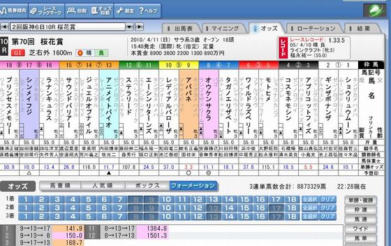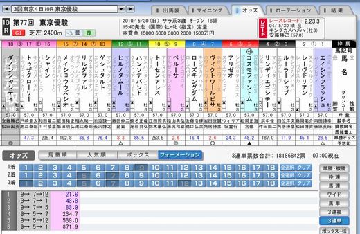 【ダービー】金曜発売好調、前年比15パーセント増 売上げは金鯱賞が前年比80.5パーセント、目黒記念74.6パーセントと低調だったが、]「史上最高」との声の高い好メンバーが揃った日本ダービーは前年比115パーセントの1億3,657万9、600円と売上げを大きく伸ばし、3レースの合計でも前年比109.6パーセント、1億5,266万2,600円と好調な数字を記録した。 発売された東西4箇所のウインズへの入場者は1万8,700名と前年をやや下回ったものの、関東地区のウインズ後楽園、ウインズ新橋では共に前年比119パーセントの入場人員を記録した 金曜発売締切時点でのダービーのオッズは以下のとおり。○単勝 7番ヴィクトワールピサ 2.1倍 岩田騎手 皐月賞1着 9番ペルーサ 2.6倍 横山騎手 無敗の4連勝 青葉賞1着 18番ダノンシャンティ 8.7倍 安藤騎手 NHKマイルC1着 12番ヒルノダムール 12倍 藤田騎手 皐月賞2着 ○3連複 7-9-12 8.0倍 7-9-18 9.3倍 3-7-9 15.6倍○3連単 9-7-12 24.0倍 7-9-12 27.3倍 9-12-7 34.9倍 7-9-18 35.8倍 9-7-3 37.5倍 7-9-18 37.9倍 (JRA発表資料、JRAホームページより) --前回のブrグ-- 「東京優駿(第77回日本ダービー)」プレ・レーティング ヴィクトワールピサ 108 116 I 皐月賞1着 (ラジオNIKKEI杯2歳S1着) ダノンシャンティ 105 115 M NHKマイルC1着 (ラジオNIKKEI杯2歳S3着) エイシンフラッシュ - 113 I 皐月賞3着 ペルーサ - 113 L 青葉賞1着 ローズキングダム 114 113 I 皐月賞4着 (朝日杯フューチュリティS1着) 今年のダービーは面白い! ブログランキングに参加しています。 記事にビビっときたらワンクリックお願いします!♪ にほんブログ村!!アダルトトラックバックやコメントはやめてください!!