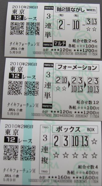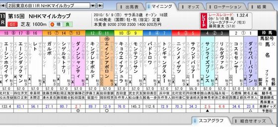 「第15回 NHKマイルカップ」私の予想は外れ<NHKマイルC>◇9日=東京◇G1◇芝1600メートル◇3歳◇出走18頭 1番人気ダノンシャンティ(牡、栗東・松田国)が直線で豪快に差し切り勝ちを決めた。勝ちタイム1分31秒4は日本レコード。ダービーの有力候補に浮上した。 前半3ハロン33秒4のハイペースを、道中は後方3番手を追走。直線で大外に持ち出すと、一気に15頭を抜き去った。安藤勝騎手は「速いペースだったし位置取りにはこだわらなかった。並んだ時には大丈夫だと思った」と笑顔を見せた。2400メートルのダービーについては「マイルくらいが乗りやすいのは確か。強い2頭(ヴィクトワールピサ、ペルーサ)がいるので胸を張って挑戦したい」と意欲を見せた。2着にはダイワバーバリアン、3着にはリルダヴァルが入った。2番人気サンライズプリンスは4着に敗れた。 払戻金は馬連(1)(13)2040円、7番人気馬単(13)(1)2680円、 10番人気3連複(1)(3)(13)3860円、9番人気3連単(13)(1)(3)1万7180円。36番人気 ▲ サンライズプリンス( 横山騎手)2番人気 2.7倍 4着 ◎ ダノンシャンティ(安藤騎手)1番人気 2.6倍 優勝 前走の毎日杯を制して4戦2勝。敗れた2戦も差のない競馬で、まだ4着以下のない堅実な成績を誇る。「前走を勝ったあとは、ここを目標に調整してきました。動きも力強いし、上々の仕上がりで臨めそうです。東京コースなら持ち味が存分に発揮できるし、とても楽しみです」と、陣営の期待は大きい。前々走の共同通信杯(2着)ではハンソデバンドにハナ差敗れたが、上がり3ハロンタイムはメンバー中最速の33秒5(推定)を記録。セールスポイントである瞬発力を活かすには、この東京コースは格好の舞台と言えるだろう。2001年のクロフネ、2004年のキングカメハメハに続く、3度目の優勝を狙う松田国英厩舎が送り出す逸材に注目が集まる。 △ ダイワバーバリアン(蛯名騎手)5番人気 20.1倍 2着 リルダヴァル(福永騎手)3番人気 6.0倍 3着〇 エイシンアポロン(岩田騎手)4番人気 11.1倍 9着 サンライズプリンスが3着を死守すればと悔やむ私でした。件数 場名 レース 式別 馬組 金額 (1) 東京(日) 11R 3連複 01-04-11 500円 (2) 東京(日) 11R 3連複 01-04-13 500円 1550円 4番人気 (3) 東京(日) 11R 3連複 01-11-13 500円 (4) 東京(日) 11R 3連複 04-11-13 500円 (5) 東京(日) 11R 3連単 11→01→04 100円 (6) 東京(日) 11R 3連単 11→01→13 100円 (7) 東京(日) 11R 3連単 11→04→01 100円 (8) 東京(日) 11R 3連単 11→04→13 100円 (9) 東京(日) 11R 3連単 11→13→01 100円 (10) 東京(日) 11R 3連単 11→13→04 100円 (11) 東京(日) 11R 3連単 13→01→04 100円 10430円 18番人気(12) 東京(日) 11R 3連単 13→01→11 100円 (13) 東京(日) 11R 3連単 13→04→01 100円 (14) 東京(日) 11R 3連単 13→04→11 100円 (15) 東京(日) 11R 3連単 13→11→01 100円 (16) 東京(日) 11R 3連単 13→11→04 100円 (17) 東京(日) 11R 3連単 11→13→01 100円 (18) 東京(日) 11R 3連単 11→13→04 100円 (19) 東京(日) 11R 3連単 13→11→01 100円 (20) 東京(日) 11R 3連単 13→11→04 100円 (21) 東京(日) 11R 3連単 11→01→13 200円 (22) 東京(日) 11R 3連単 11→04→13 200円 (23) 東京(日) 11R 3連単 13→01→11 200円 (24) 東京(日) 11R 3連単 13→04→11 200円 (25) 東京(日) 11R 3連単 01→11→13 100円 (26) 東京(日) 11R 3連単 01→13→11 100円 (27) 東京(日) 11R 3連単 04→11→13 100円 (28) 東京(日) 11R 3連単 04→13→11 100円 合計 4,800円 小倉競馬場にて リルダヴァルも追加して買った3連複は当たりました! ブログランキングに参加しています。 記事にビビっときたらワンクリックお願いします!♪ にほんブログ村!!アダルトトラックバックやコメントはやめてください!!