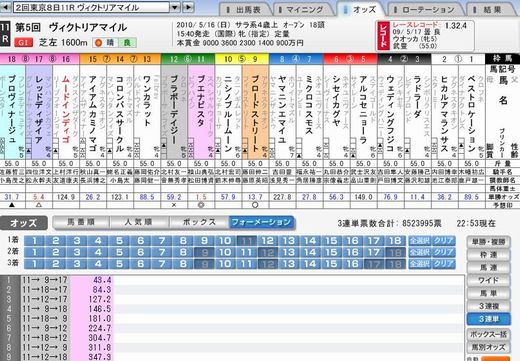 第5回ヴィクトリアマイル(GI) 私の予想は外れ 単勝1・5倍のブエナビスタ(牝4、栗東・松田博)が人気に応えて鮮やかに差し切った。勝ち時計は1分32秒4。中団から直線は大外に持ち出してゴール直前で測ったように差しを決めた。ドバイ遠征帰りの不安説をはねのけ、4つ目のG1タイトルを手にした。首差2着に8番人気のヒカルアマランサス、3着には11番人気のニシノブルームーンが入った。 馬連(2)(11)は2490円、7番人気馬単(11)(2)は2780円、9番人気3連複(2)(10)(11)は2万9700円、72番人気3連単(11)(2)(10)は8万5770円。201番人気3連単件数 場名 レース 式別 馬組 金額 (1) 東京(日) 11R 3連単 11→09→12 300円 (2) 東京(日) 11R 3連単 11→09→17 400円 (3) 東京(日) 11R 3連単 11→09→18 300円 (4) 東京(日) 11R 3連単 11→12→09 300円 (5) 東京(日) 11R 3連単 11→12→17 300円 (6) 東京(日) 11R 3連単 11→12→18 300円 (7) 東京(日) 11R 3連単 11→18→09 300円 (8) 東京(日) 11R 3連単 11→18→12 300円 (9) 東京(日) 11R 3連単 11→18→17 300円 (10) 東京(日) 11R 3連単 09→11→12 200円 (11) 東京(日) 11R 3連単 09→11→17 200円 (12) 東京(日) 11R 3連単 09→11→18 200円 (13) 東京(日) 11R 3連単 12→11→09 100円 (14) 東京(日) 11R 3連単 12→11→17 100円 (15) 東京(日) 11R 3連単 12→11→18 100円 (16) 東京(日) 11R 3連単 18→11→09 100円 (17) 東京(日) 11R 3連単 18→11→12 100円 (18) 東京(日) 11R 3連単 18→11→17 100円 合計 4,000円 3連複は件数 場名 レース 式別 馬組 金額 (1) 東京(日) 11R 3連複 09-11-12 400円 (2) 東京(日) 11R 3連複 09-11-17 400円 (3) 東京(日) 11R 3連複 09-11-18 400円 (4) 東京(日) 11R 3連複 11-12-17 400円 (5) 東京(日) 11R 3連複 11-12-18 300円 (6) 東京(日) 11R 3連複 11-17-18 300円 合計 2,200 9-11 1140円(3番人気) 11-18 1970円(4番人気) 私の本命はブエナビスタ(1番人気 1.6倍) 対抗はをブロードストリート(4番人気 13.5倍:5着) --前回のブログ-- 2強が圧倒的な差をつけているには人気がない ブエナビスタとレッドディザイアの馬連は150円以下と予想する これは高いのか低いのか微妙? ◎ ブエナビスタ (6枠11番 横山騎手)1番人気 1.5倍 優勝京都記念1着・ドバイシーマクラシック2着 (有馬記念2着) △ レッドディザイア(8枠17番 四位騎手) 2番人気 5.7倍 ハナ差4着アル・マクトゥームチャレンジラウンド3 1着 (ジャパンC3着) アイアムカミノマゴ (7枠15番 秋山騎手)6番人気 27.6倍 10着阪神牝馬S1着 (桜花賞6着) X ブラボーデイジー (6枠12番 北村騎手)9番人気 51.5倍 8着福島牝馬S2着 (ヴィクトリアマイル2着) ワンカラット 牝 4 藤岡 健一 104 M 103 M 京都牝馬S4着・阪急杯2着 (フィリーズレビュー1着・桜花賞4着) ブログランキングに参加しています。 記事にビビっときたらワンクリックお願いします!♪ にほんブログ村!!アダルトトラックバックやコメントはやめてください!!