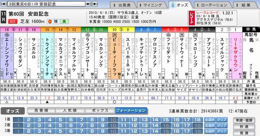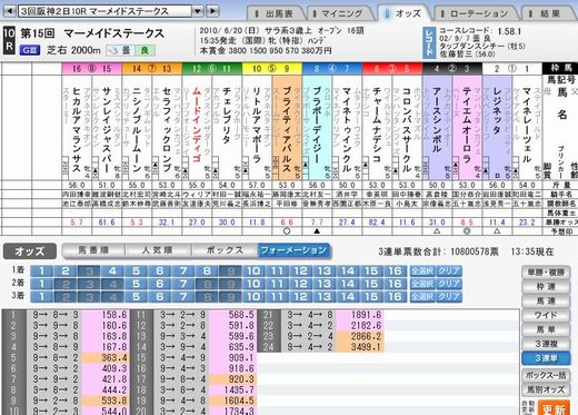 「第51回 宝塚記念」私の予想は外れ 春のグランプリは8番人気のナカヤマフェスタ(牡4、美浦・二ノ宮)が豪快な末脚で差し切り、大金星を挙げた。勝ち時計は2分13秒0。 好位を追走したブエナビスタとアーネストリーが直線で抜け出し、ゴール前でたたき合う外をナカヤマフェスタが一気に抜き去った。06年高松宮記念のオレハマッテルゼ以来のG1勝利となった柴田善騎手は「気の悪さも出ず、意外と気分良く走れた。まじめに走ればと思っていたが、100%の力を出すことができた」と笑顔。サッカーW杯が開催された年の宝塚記念は、1986年から4歳馬が6連勝しているが、今年も4歳の伏兵が勝利した。 1番人気ブエナビスタは半馬身差の2着、3着はアーネストリー。 馬連(8)(17)5150円、 15番人気馬単(17)(8)1万6990円、49番人気3連複(2)(8)(17)7920円、22番人気3連単(17)(8)(2)7万7160円。222番人気 穴馬の選定を間違えた! ◎ 5枠10番 ジャガーメイル C.ウィリアムズ 2番人気 5.1倍 8着 〇 4枠 8番 ブエナビスタ 横山典弘 1番人気 2.4倍 2着 ▲ 3枠 6番 セイウンワンダー 福永祐一 7番人気 27.4倍 16着 △ 1枠 2番 アーネストリー 58 佐藤哲三 3番人気 6.4倍 3着 △ 5枠 9番 ロジユニヴァース 安藤勝己 5番人気 8.9倍 13着 件数 場名 レース 式別 馬組 金額 的中 (1) 阪神(日) 10R 枠 連 ながし 軸枠: 5相手: 1, 3 各500円(計1,000円) (2) 阪神(日) 10R 枠 連 3- 4 500円 (3) 阪神(日) 10R 馬 連 ながし 軸馬:06相手:08,10 各500円(計1,000円) (4) 阪神(日) 10R 馬 連 02-10 500円 (5) 阪神(日) 10R 3連複 軸2頭ながし 軸馬:06-08相手:02,09,10 各300円(計900円) 購入金額 3,900円 払戻金額 0円 件数 場名 レース 式別 馬組 金額 的中 (1) 阪神(日) 10R 3連複 軸2頭ながし 軸馬:06-10相手:02,08,09 各300円(計900円) (2) 阪神(日) 10R 3連単 フォーメーション 1着:06,102着:06,103着:02,08,09 各100円(計600円) (3) 阪神(日) 10R 3連単 フォーメーション 1着:06,102着:02,08,093着:06,10 各100円(計600)購入金額 2,100円 払戻金額 0円 穴狙いの勝負 ---前回のブログ-- 今回は、枠連1-5も抑えたい。 今年絶好調な横山騎手が騎乗するブエナビスタ か 春の天皇賞馬ジャガーメイルのどちらを本命にするか迷うが 上がり馬アーネストリーは3番手評価である。 すると第51回 宝塚記念の51に連動した馬券となるので、 面白馬券として遊び心で買うつもりである。 同僚はワールドカップサッカーの第3戦 デンマーク戦でゴールを決めた 本田-遠藤-岡崎のユニフォーム番号から3連単を買うとのこと。 1枠 1番 イコピコ 牡4 58 岩田康誠1枠 2番 アーネストリー 牡5 58 佐藤哲三 金鯱賞優勝2枠 3番 ネヴァブション 牡7 58 後藤浩輝2枠 4番 スマートギア 牡5 58 和田竜二3枠 5番 ナムラクレセント 牡5 58 小牧太3枠 6番 セイウンワンダー 牡4 58 福永祐一4枠 7番 マイネルアンサー 牡6 58 川田将雅4枠 8番 ブエナビスタ 牝4 56 横山典弘5枠 9番 ロジユニヴァース 牡4 58 安藤勝己5枠10番 ジャガーメイル 牡6 58 C.ウィリアムズ6枠11番 トップカミング 牡4 58 浜中俊6枠12番 メイショウベルーガ 牝5 56 幸英明7枠13番 フォゲッタブル 牡4 58 蛯名正義7枠14番 マキハタサイボーグ セン8 58 太宰啓介7枠15番 コパノジングー 牡5 58 藤岡佑介8枠16番 アクシオン 牡7 58 藤田伸二8枠17番 ナカヤマフェスタ 牡4 58 柴田善臣8枠18番 ドリームジャーニー 牡6 58 池添謙一 ブエナビスタと レッドディザイアの対決が楽しみだ! ブログランキングに参加しています。 記事にビビっときたらワンクリックお願いします!♪ にほんブログ村!!アダルトトラックバックやコメントはやめてください!!