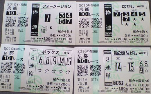 「第46回 CBC賞」 私の予想は当たり その2。確定する前に最後の直線で審議があり、 ダッシャーゴーゴーがワンカラットの進路妨害について、 審議対象となったが、そのままとなった。アセアセ。 降着となれば、枠連が外れ馬券となる処であった。 また、小倉競馬場で2回買いました馬券も当たった! --前回のブログ-- 好スタートを決め先手を奪ったヘッドライナー(せん6、栗東・西園)が、経済コースの内ラチ沿いを逃げ粘り、外から並ぶように追い込んだ2着ダッシャーゴーゴー、3着ワンカラットの追撃をしのぎ、1分8秒9のタイムで重賞初制覇を飾った。幸騎手は「最後は粘り込めると思った。1400メートルより1200メートルの方がいいと思っていたし、今年初重賞。うれしいです」と話した。 枠連3-7は2010円 10番人気馬連(6)(15)は5290円、24番人気馬単(6)(15)は1万630円、42番人気3連複(6)(8)(15)は1万5980円、53番人気3連単(6)(15)(8)は9万6400円。306番人気 件数 場名 レース 式別 馬組 金額 (1) 京都(日) 10R 枠 連 3- 7 300円 (2) 京都(日) 10R 枠 連 4- 7 300円 (3) 京都(日) 10R 枠 連 5- 7 300円 (4) 京都(日) 10R 枠 連 7- 7 300円 (5) 京都(日) 10R 3連複 06-08-09 100円 (6) 京都(日) 10R 3連複 06-08-14 100円 (7) 京都(日) 10R 3連複 06-08-15 100円 (8) 京都(日) 10R 3連複 06-09-14 100円 (9) 京都(日) 10R 3連複 06-09-15 100円 (10) 京都(日) 10R 3連複 06-14-15 200円 (11) 京都(日) 10R 3連複 08-09-14 100円 (12) 京都(日) 10R 3連複 08-09-15 100円 (13) 京都(日) 10R 3連複 08-14-15 200円 (14) 京都(日) 10R 3連複 09-14-15 200円 (15) 京都(日) 10R 馬 連 06-14 200円 (16) 京都(日) 10R 馬 連 08-14 200円 (17) 京都(日) 10R 馬 連 09-14 200円 (18) 京都(日) 10R 馬 連 14-15 200円 (19) 京都(日) 10R ワイド 06-14 200円 (20) 京都(日) 10R ワイド 09-14 200円 (21) 京都(日) 10R ワイド 14-15 300円 合計 4,000 ◎ ケイアイアストン(7枠14番 的場騎手)11番人気 22.9倍 9着 〇 ダッシャーゴーゴー(7枠15番 古川騎手)7番人気 13.4倍 2着 ▲ シンボリグラン(5枠9番 岩田騎手)1番人気 4.9倍 6着 最近、絶不調なので枠連と3連複を買う 3連複は印の5頭のBOX買い 枠連は7枠からの4点買い ブログランキングに参加しています。 記事にビビっときたらワンクリックお願いします!♪ にほんブログ村!!アダルトトラックバックやコメントはやめてください!!