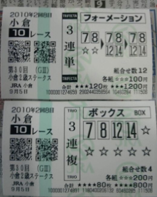 「第24回 セントウルステークス」 私の予想は大当たり <1> PATは残念ながら馬単のみ <1> 29 阪神 日 10R 馬単 01→11 300円 - - 0円 30 阪神 日 10R 馬単 01→13 200円 - - 0円 31 阪神 日 10R 馬単 01→16 200円 - - 0円 阪神 日 10R 馬単 11→01 300円 11→01 7,900円 23,700円 33 阪神 日 10R 馬単 13→01 200円 - - 0円 34 阪神 日 10R 馬単 16→01 200円 - - 0円 トータル 5,000円 23,700円 土曜日の夜、PAT購入時は 1,16-1,11,13,16-1,11,13,16で勝負 日曜日に日刊スポーツを見て、馬券を見直しした。 PATは残念ながら馬連のみ 場外馬券は、馬連・馬単・3連複・3連単 すべてゲット --前回のブログ-- いざ 秋競馬にチャレンジ 一番人気が予想されたキンシャサノキセキが【9/11(土) 6:30に出走取消】 香港馬に敬意を表して本命へ ◎ グリーンバーディー (1枠1番 マーク騎手)2番人気 6.2倍 2着 〇 ダッシャーゴーゴー (6枠11番 川田騎手)4番人気 9.6倍 優勝 ▲ スカイノダン(8枠 16番 国分騎手)1番人気 4.3倍 6着 △ ヘッドライナー(7枠 13番 幸騎手)3番人気 8.2倍 4着 場外馬券にはメリッサを追加△ メリッサ(3枠6番 福永騎手)5番人気 10.2倍 3着 ---先週のブログ-- 「第30回 小倉2歳ステークス」 私の予想は当たり ◎ ブラウンワイルド (4枠8番 浜中騎手)1番人気 3.6倍 優勝 〇 スギノエンデバー(4枠7番 藤岡騎手)9番人気 30.0倍 3着 ▲ シゲルキョクチョウ (7枠14番 幸騎手)2番人気 4.2倍 2着 △ ドレッドノート(6枠12番 佐藤騎手)3番人気 5.2倍 15着 ゴール前の大接戦を制したのは、外から突っ込んできた1番人気ブラウンワイルド(牡、栗東・坂口正則)だった。好スタートを決めたシゲルキョクチョウが軽快に逃げ、直線はいったん突き放した。しかし外から一気に強襲したブラウンワイルドが、ゴール寸前でとらえた。3着にはスギノエンデバー(牡、栗東・浅見)が入った。 ブラウンワイルドに騎乗した浜中騎手は「何とか届いてくれ、という思いで追っていた。道中は速い流れに対応できなかったが、直線に向いてからはこの馬らしい脚だった。馬に助けられました」と話した。 馬連(8)(14)は790円、1番人気馬単(8)(14)は1300円、1番人気3連複(7)(8)(14)は6370円、15番人気3連単(8)(14)(7)は2万3440円。52番人気 通番 場名 曜日 レース 式別 馬/組番 購入金額 的中/返還 払戻単価 払戻/返還金額 馬券 01 小倉 日 10R 3連複 07-08-12 200円 - - 0円 02 小倉 日 10R 3連複 07-08-14 200円 07-08-14 6,370円 12,740円 03 小倉 日 10R 3連複 07-12-14 200円 - - 0円 04 小倉 日 10R 3連複 08-12-14 200円 - - 0円 05 小倉 日 10R 3連単 07→08→12 100円 - - 0円 06 小倉 日 10R 3連単 07→08→14 100円 - - 0円 07 小倉 日 10R 3連単 07→12→08 100円 - - 0円 08 小倉 日 10R 3連単 07→12→14 100円 - - 0円 09 小倉 日 10R 3連単 07→14→08 100円 - - 0円 10 小倉 日 10R 3連単 07→14→12 100円 - - 0円 11 小倉 日 10R 3連単 08→07→12 100円 - - 0円 12 小倉 日 10R 3連単 08→07→14 100円 - - 0円 13 小倉 日 10R 3連単 08→12→07 100円 - - 0円 14 小倉 日 10R 3連単 08→12→14 100円 - - 0円 15 小倉 日 10R 3連単 08→14→07 100円 08→14→07 23,440円 23,440円 16 小倉 日 10R 3連単 08→14→12 100円 - - 0円 トータル 2,000円 36,180円 patと小倉競馬場での同一馬券にて2重の喜び ---前回のブログ--- 夏の小倉競馬 最終日である。 次は12月に開催される。 穴馬を〇に ◎ ブラウンワイルド (4枠8番 浜中騎手)2番人気 5.1倍 〇 スギノエンデバー(4枠7番 藤岡騎手)10番人気 25.2倍 ▲ シゲルキョクチョウ (7枠14番 幸騎手)1番人気 5.0倍 △ ドレッドノート(6枠12番 佐藤騎手)3番人気 6.0倍 馬券は3練単 7,8-7,8,12,14-7,8,12,14 3連複 7,8,12,14 boxで 今日の小倉は晴れ。 ブログランキングに参加しています。 記事にビビっときたらワンクリックお願いします!♪ にほんブログ村!!アダルトトラックバックやコメントはやめてください!!