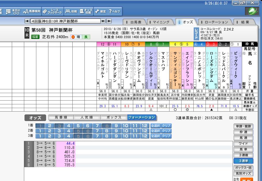 「第58回 神戸新聞杯(菊花賞トライアル)」 私の予想は外れ まるで本番さながらの、火の出るような競り合いを制したのは新コンビ武豊騎手を背にしたローズキングダム(牡、栗東・橋口)だった。ダービー1、2着馬の激突で注目を集めた菊花賞TRは、直線の激しいたたき合いの末、ダービーとは着順が入れ替わって首差2着にエイシンフラッシュ。3着ビッグウィークまでが菊花賞優先出走権を手にした。 1000メートル通過1分3秒台のスローペースでも、中団に位置したダービー上位2頭の底力は抜けていた。夏の上り馬ビッグウィークがハナを切り、最後の直線で逃げ切りに態勢に入ったが、馬群に包まれていた内キングダム、外フラッシュの2頭が抜け出すと、200メートルに及ぶ一騎打ちを演じた。 武豊騎手は「とにかく折り合いに気をつけて乗った。本番に向けて距離は問題ないと思うし、最後は差し返されると思ったけどよく我慢してくれた。(相手は)さすがダービー馬だなと思った」と話した。勝ち時計は2分25秒9。 馬連(3)(5)240円、1番人気馬単(3)(5)560円、2番人気3連複(1)(3)(5)770円、3番人気3連単(3)(5)(1)2570円。6番人気 ダービー1・2着馬 は強いが、58回のゴロ合わせで◎ エイシンフラッシュ(5枠5番 内田騎手)1番人気 1.9倍 2着〇 サンディエゴシチー(5枠6番 川田騎手)6番人気 27.9倍 9着▲ ローズキングダム(3枠3番 武騎手)2番人気 3.0倍 優勝△ ビッグウィーク(1枠1番 川田騎手)5番人気 12.7倍 3着△ シルクオールディー(6枠8番 四位騎手)4番人気 12.3倍 10着 3連単は2頭マルチ 5,6-1,3,83連複は2頭軸 5,6-1,3,8 ローズキングダム(3枠3番 武騎手)1番人気 2.7倍今回は武豊騎手に鞍上をスイッチ。「第一人者が空いているということだったので、お願いした。この馬のいい面を引き出して欲しい」と、騎乗依頼の経緯をこう語った橋口弘次郎調教師。「外見も中身も、何も変わっていない。あまり成長を感じない」とトレーナーは辛口の評価。母のローズバドは3歳秋初戦のローズSでオークスからプラス14キロの426キロだった。小柄でも末脚の切れは超一流、というのがこの血統の特徴なら、特に気にする必要はないだろう。菊花賞に向けて、めどの立つ競馬をしたいところだ。 エイシンフラッシュ(5枠5番 内田騎手)2番人気 2.7倍いよいよダービー馬が秋の始動戦を迎える。「恥ずかしくない状態には仕上げているけど、目標はまだまだ先にある。ここで作り過ぎるわけにもいかないし、これから良くなっていってもらわないと」と陣営にとって、今回はあくまで前哨戦との認識。だが、攻めの動きは相変わらず一級品で、期待が大きくなるのも仕方がないところだ。「外見はそれほど変わってないが、中身は間違いなく成長している。精神状態もいいと思う」と、藤原英昭調教師。まずはこのトライアルで好スタートを切って、菊花賞へと駒を進めたい。 レーヴドリアン(7枠10番 福永騎手)3番人気 8.9倍 豪快な追い込みが身上の馬だが、春シーズンの後半はそれが空回りする状態になってしまったようだ。「収得賞金を加算できていれば、楽だったんだが...。結果的に厳しい日程になってしまったのが痛かった」と、振り返る松田博資調教師。当時はイライラしている面もあったというように、精神的に追い込まれていた状態だったのだろう。「外見からは成長がわかりにくいタイプで、体高が少し伸びたかなという程度だろう。1番いいのは、のんびりとしていることじゃないかな」と、トレーナーは同馬の精神面の成長に満足している様子。状態が戻っている今回は、実績的にも怖い1頭となるはずだ。 ビッグウィーク(1枠1番 川田騎手)5番人気 11.7倍 "今夏最大の上がり馬"と言えば、この馬だろう。未勝利で足踏みをしていたのが嘘のような3連勝。「休養前はソエや骨りゅうに悩まされていた。調教で時計を出していたし、素質は感じていたんです」と、陣営は脚部不安が治まったことを快進撃の理由に挙げた。「夏場を使ってきたのに、疲れどころか、状態がさらに上がってきた感じ。前走から馬体重がさらに増えていそうなのも、いい傾向でしょうね」と、まだまだ上昇カーブを描いている同馬に期待十分の印象。差しタイプの有力馬が多い今回のメンバー構成も、先行タイプのこの馬にとって大きな魅力となりそうだ。 シルクオールディー(6枠8番 四位騎手)4番人気 9.4倍北海道シリーズで500万下(函館・芝2600m)、1000万下の阿寒湖特別(札幌・芝2600m)と長距離レースを2連勝中サンディエゴシチー(5枠6番 川田騎手)6番人気 22.7倍フレグモーネによる調整遅れで、春のクラシック戦線は弥生賞からのスタートだった当初の予定をスプリングSへと変更。順調さを欠いた状態でのスプリングS(10着)、皐月賞(15着)は、結果が伴わなかった。しかし、エイシンフラッシュ、ローズキングダムに次ぐ、上がり3ハロンタイム(33秒0、推定)をマークし、0秒5差まで追い上げた日本ダービー(8着)の走りこそが、この馬本来の実力と思って良さそうだ。本数以上にハードな攻めをこなしてきた今回