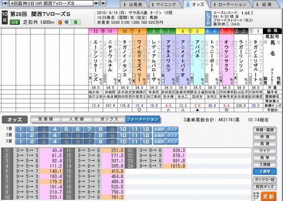 「第28回 関西テレビ放送賞 ローズステークス」 私の予想は外れ 4番人気のアニメイトバイオ(栗東・牧)が豪快な末脚で重賞初勝利を決めた。ハイペースで進む中、後方で脚をためると、直線では馬場中央から抜群の瞬発力を披露。ゴール前では圧倒的1番人気に推されたアパパネが先に抜け出したが、一気にかわし去った。勝ち時計は1分45秒8。「ここがG1のような舞台だと思って、プレッシャーをかけて挑みました。春から期待以上の変わり身を見せてくれました。心身ともに成長しています。後は無事に本番を待つだけです」と後藤騎手は秋華賞を楽しみにした。なお、開業3年目の牧調教師にとってもこれがJRA重賞初勝利となった。2着はワイルドラズベリー、3着にはエーシンリターンズが入り、秋華賞出走権を手にした。牝馬クラシック2冠のアパパネは4着に終わった。 馬連(6)(9)は7300円、 22番人気馬単(6)(9)は1万5280円、 40番人気3連複(6)(9)(12)は2万1080円、 49番人気3連単(6)(9)(12)は19万3040円。 318番人気ジンクス(オークス馬の優勝がない)h生きていたが、軸馬が外れ 3着までに来ないとはトホホ 今日のレースは当たりそうにないがトライする。 --前日のブログ-- ジンクスを信じて穴狙い! ◎ オウケンサクラ(3枠3番 内田騎手)3番人気 5.4倍 8着 〇 ワイルドラズベリー(7枠9番 安藤騎手)4番人気 12.4倍 2着 ▲ アパバネ(5枠5番 蛯名騎手)1番人気 2.1倍 4着 △ アグネスワルツ(6枠7番 柴田騎手)2番人気 4.1倍 7着 △ アニメイトバイオ(5枠6番 後藤騎手)6番人気 15.6倍 優勝 ---前回のブログ-- 有力馬情報 2冠馬アパバネ 参戦 桜花賞は当たりオークス馬券が外れた軸馬 オウケンサクラも参戦 アパパネ桜花賞を制し、サンテミリオンと同着でオークスのタイトルも手中にした春シーズンは、アパパネ陣営にとって大満足の結果だったに違いない。牝馬三冠制覇が懸かる秋シーズンは、今回で3度目(昨年暮れの阪神ジュベナイルフィリーズ出走時、今年のチューリップ賞~桜花賞出走時)となる栗東トレーニング・センターでの調整で臨む。ひと夏を順調に越した同馬は、これまでよりも大人になった印象を受ける。「ずいぶんと落ち着いていますね。精神面が成長したんだと思います」と、陣営は春との違いを感じている様子。前哨戦から、しっかりと結果を出してくれるはずだ。ゴール前の大接戦を制したのは、 アグネスワルツ骨折明けにもかかわらず、オークストライアルのフローラSが2着。本番のオークスも3着と踏ん張った春の2戦。「思っていた以上に、すごい馬だった」と愛馬を評した宮本博調教師が、秋にかける思いはもちろん強い。「猛暑のせいで少しぼんやりとしていた感じだけど、レースが近づいてピリッとしてきた。同じ休み明けでも、今回は順調にきてのものだからね」と、手応えをしっかりと感じとっての出走。脚質的には、阪神・芝の外回りコースよりも本番の京都・芝の内回りコースの方が適性は高いはず。このレースで好結果を出すことができれば、秋華賞が大いに楽しみになる オウケンサクラ桜花賞2着、オークス5着とあと一歩のところでクラシック制覇が叶わなかった春シーズンだが、能力の高さは証明した。いい脚を長く使えるこの馬の特徴を活かすことができれば、念願のGI タイトルにリーチをかけることも十分に可能だろう。「馬体は増えて出ることになるだろうけど、ほとんどが成長分だからね」と音無秀孝調教師は、ひと夏を越して逞しく成長した同馬をこう評した。母ランフォザドリームは、古馬になって重賞を2勝。晩成タイプの血を受け継いでいるこの馬に対する期待も高まっているようだ。アニメイトバイオ昨秋に500万下のサフラン賞(東京・芝1400m)を2歳コースレコードで優勝してから勝ち星にこそ恵まれていないが、阪神ジュベナイルフィリーズの2着を筆頭に、クラシック戦線でコンスタントな活躍。4着だった前走のオークスは、アパパネ、サンテミリオンに次ぐ3位となる上がり3ハロン35秒4(推定)の末脚を発揮。クラシックの大舞台でも通用する能力を改めて証明している。アパパネと同様に早めの栗東トレーニング・センターへの入厩を選択し、直前の長距離輸送の負担を軽くする形で今回は挑む。これは過去の関西遠征時にはなかったことだ。桜花賞(8着)出走時は馬体重がマイナス20キロという大幅な馬体減となったが、今回は心配しなくてもよさそう。ワイルドラズベリー前走オープン特別の白百合S(京都・芝1800m)を勝って、収得賞金を加算。「記録的な猛暑を避けて夏場を休養にあて、このレースに照準を絞れたのが大きかった」と陣営は語っていた。今夏のリフレッシュは精神面の成長も促しているようで、「GI を走ってきた馬が相手だから、楽ではないでしょう。でも、春のこの馬は相手がどうこうではなく、自分自身が落ち着いているかのほうが課題だった。能力を発揮した時に、どれだけ通用するのか見てみたいんです」と中尾秀正調教師。試金石のレースで好結果を出すことができれば、本番の秋