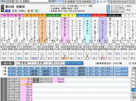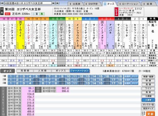 「第35回 エリザベス女王杯」私の予想は当たり 英愛オークス馬スノーフェアリー(3、英)が豪快な末脚で差し切り勝ちを収めた。1番人気アパパネをマークしながら中団で脚をため、4コーナーで内へ。先行勢をあっさり飲み込むと、ラチ沿いをぐいぐい伸びて2着メイショウベルーガを4馬身突き放した。R・ムーア騎手は「スタートからすべて順調にいった。4コーナーは、うまく前が開いて自然に内に進路を取ることができた」と会心の笑顔を見せた。状態に問題がなければ、次走は28日東京のジャパンC(G1、芝2400メートル)に向かう予定。3着は1番人気のアパパネが入った。4着のリトルアマポーラとはハナ差 写真判定を待つ時間が長く感じられた!第35回で 枠連(3)(5) JRAの暗号馬券か? 枠連(3)(5)320円、1番人気 馬連(6)(9)1430円、5番人気馬単(6)(9)3590円、12番人気3連複(5)(6)(9)1320円、2番人気 3連単(6)(9)(5)10170円。23番人気---朝のブログ-- プレ・レーティングの値を信じスノーフェアリー本命 古馬勢の代表格 メイショウベルーガを対抗に 私の馬券は (1) 京都(日) 11R 3連単 軸2頭ながしマルチ 軸馬:06,09相手:05,12,16 各100円(計1,800円) (2) 京都(日) 11R 3連単 軸2頭ながしマルチ 軸馬:06,16相手:05,09,12 各100円(計1,800円) (3) 京都(日) 11R 3連単 フォーメーション 1着:062着:05,09,12,163着:05,09,12,16 各100円(計1,200円) (4) 京都(日) 11R 3連単 フォーメーション 1着:05,09,12,162着:063着:05,09,12,16 各100円(計1,200円) (5) 京都(日) 11R 3連複 軸1頭ながし 軸馬:06相手:05,09,12,16 各500円(計3,000円) 購入金額 9,000円 払戻金額 0 「第35回 エリザベス女王杯」プレ・レーティング スノーフェアリー(愛) Snow Fairy 牝 3 E.ダンロップ 118 L 英国 イギリス、アイルランドのオークス(ともに国際G1・芝2400m)を制したスノーフェアリー(牝3・E.ダンロップ)は、すでに名牝としての評価を得ている馬。前走の英セントレジャー(国際G1・芝2920m)は4着に敗退しているが、牡馬を相手に後方から差を詰める形での4着と、能力の高さは改めて示した。日本の馬場にマッチングすれば、怖い存在となりそう。 アーヴェイ(英) Ave 牝 4 R.アトフィールド 112 I 加国 アーヴェイ(牝4・R.アトフィールド)は、アメリカのベルモントパークで行われた前走のフラワーボウル招待(国際G1・芝2000m)で昨年の秋華賞馬レッドディザイアを3着に退けて、G1 初制覇を達成。2歳秋のデビューから3歳秋までは英・愛で出走して4勝を挙げ、その後カナダに移籍して北米を拠点に活躍している馬だが、高速馬場でのスピード勝負より時計のかかる馬場でのスタミナ勝負を得意とするタイプ。当日の天候次第で大きく浮上する。アパパネ 牝 3 国枝 栄 112 I 秋華賞1着 日本を代表する存在は、前走の秋華賞を制して、7年ぶりに史上3頭目の三冠牝馬となったアパパネ(牝3・国枝栄)だ。昨年の阪神ジュベナイルフィリーズも含め、GI・JpnI の大舞台では負けたことがないという勝負強さが、アパパネのなによりの魅力と言える。この馬の能力さえ発揮できれば、おのずと結果はついてくるはず。 ヒカルアマランサス 牝 4 池江 泰郎 112 M ヴィクトリアマイル2着 サンテミリオン 牝 3 古賀 慎明 111 L 優駿牝馬1着 メイショウベルーガ 牝 5 池添 兼雄 112 L 京都大賞典1着 古馬勢の代表格は、メイショウベルーガ(牝5・池添兼雄)が務めることになる。一昨年の菊花賞馬で、昨年のジャパンカップ2着のオウケンブルースリを半馬身差の2着に押さえ込んだ前走の京都大賞典は、単なるGII 勝ちという以上に価値の高いもの。京都の芝・外回りコースでは、今年の日経新春杯・京都大賞典と重賞2勝を含む4勝をマークしており、得意の舞台で悲願のGI 制覇を狙う。アニメイトバイオ 牝 3 牧 光二 110 I 秋華賞2着 ブログランキングに参加しています。 記事にビビっときたらワンクリックお願いします!♪ にほんブログ村!!アダルトトラックバックやコメントはやめてください!!