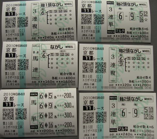 「第35回 エリザベス女王杯」私の予想は当たり その2 英愛オークス馬スノーフェアリー(3、英)が豪快な末脚で差し切り勝ちを収めた。1番人気アパパネをマークしながら中団で脚をため、4コーナーで内へ。先行勢をあっさり飲み込むと、ラチ沿いをぐいぐい伸びて2着メイショウベルーガを4馬身突き放した。R・ムーア騎手は「スタートからすべて順調にいった。4コーナーは、うまく前が開いて自然に内に進路を取ることができた」と会心の笑顔を見せた。状態に問題がなければ、次走は28日東京のジャパンC(G1、芝2400メートル)に向かう予定。3着は1番人気のアパパネが入った。4着のリトルアマポーラとはハナ差 写真判定を待つ時間が長く感じられた!第35回で 枠連(3)(5) JRAの暗号馬券か? 枠連(3)(5)320円、1番人気 馬連(6)(9)1430円、5番人気馬単(6)(9)3590円、12番人気3連複(5)(6)(9)1320円、2番人気 3連単(6)(9)(5)10170円。23番人気 小倉競馬場で購入した当たり馬券 馬連・馬単・3連複・3連単総べて当たり 久しぶりにG1が当たった。 このレースを外国馬が勝利したのは初めてだが、 英愛オークス馬のスノーフェアリーだからかも 不思議なことに両隣の枠はどちらもオークス馬だった。 5番 アパバネ 6番 スノーフェアリー 7番 サンテミリオン やはり暗号ではと穿った次第でした。 ---昨日ののブログ-- プレ・レーティングの値を信じスノーフェアリー本命 古馬勢の代表格 メイショウベルーガを対抗に 私の馬券は (1) 京都(日) 11R 3連単 軸2頭ながしマルチ 軸馬:06,09相手:05,12,16 各100円(計1,800円) (2) 京都(日) 11R 3連単 軸2頭ながしマルチ 軸馬:06,16相手:05,09,12 各100円(計1,800円) (3) 京都(日) 11R 3連単 フォーメーション 1着:062着:05,09,12,163着:05,09,12,16 各100円(計1,200円) (4) 京都(日) 11R 3連単 フォーメーション 1着:05,09,12,162着:063着:05,09,12,16 各100円(計1,200円) (5) 京都(日) 11R 3連複 軸1頭ながし 軸馬:06相手:05,09,12,16 各500円(計3,000円) 購入金額 9,000円 払戻金額 0 「第35回 エリザベス女王杯」プレ・レーティング スノーフェアリー(愛) Snow Fairy 牝 3 E.ダンロップ 118 L 英国 イギリス、アイルランドのオークス(ともに国際G1・芝2400m)を制したスノーフェアリー(牝3・E.ダンロップ)は、すでに名牝としての評価を得ている馬。前走の英セントレジャー(国際G1・芝2920m)は4着に敗退しているが、牡馬を相手に後方から差を詰める形での4着と、能力の高さは改めて示した。日本の馬場にマッチングすれば、怖い存在となりそう。 アーヴェイ(英) Ave 牝 4 R.アトフィールド 112 I 加国 アーヴェイ(牝4・R.アトフィールド)は、アメリカのベルモントパークで行われた前走のフラワーボウル招待(国際G1・芝2000m)で昨年の秋華賞馬レッドディザイアを3着に退けて、G1 初制覇を達成。2歳秋のデビューから3歳秋までは英・愛で出走して4勝を挙げ、その後カナダに移籍して北米を拠点に活躍している馬だが、高速馬場でのスピード勝負より時計のかかる馬場でのスタミナ勝負を得意とするタイプ。当日の天候次第で大きく浮上する。アパパネ 牝 3 国枝 栄 112 I 秋華賞1着 日本を代表する存在は、前走の秋華賞を制して、7年ぶりに史上3頭目の三冠牝馬となったアパパネ(牝3・国枝栄)だ。昨年の阪神ジュベナイルフィリーズも含め、GI・JpnI の大舞台では負けたことがないという勝負強さが、アパパネのなによりの魅力と言える。この馬の能力さえ発揮できれば、おのずと結果はついてくるはず。 ヒカルアマランサス 牝 4 池江 泰郎 112 M ヴィクトリアマイル2着 サンテミリオン 牝 3 古賀 慎明 111 L 優駿牝馬1着 メイショウベルーガ 牝 5 池添 兼雄 112 L 京都大賞典1着 古馬勢の代表格は、メイショウベルーガ(牝5・池添兼雄)が務めることになる。一昨年の菊花賞馬で、昨年のジャパンカップ2着のオウケンブルースリを半馬身差の2着に押さえ込んだ前走の京都大賞典は、単なるGII 勝ちという以上に価値の高いもの。京都の芝・外回りコースでは、今年の日経新春杯・京都大賞典と重賞2勝を含む4勝をマークしており、得意の舞台で悲願のGI 制覇を狙う。アニメイトバイオ 牝 3 牧 光二 110 I 秋華賞2着 ブログランキングに参加しています。 記事にビビっときたらワンクリックお願いします!♪ にほんブログ村!!アダルトトラックバックやコメントはやめてください!!