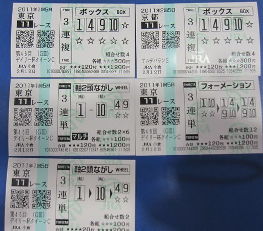クイーンCの当たり馬券が危うく外れ馬券に 2番人気ホエールキャプチャ(美浦・田中清)が池添騎手の手綱で直線抜け出して、うれしい重賞初勝利を飾った。好スタートを決めて折り合い、中団外めの包まれない位置から運ぶ危なげのないレース運び。直線の坂を上り切ったあたりで先頭に立つと、後続の追撃を抑えて1分35秒4でゴールイン。2着は内を突いた5番人気マイネイサベル、3着は外から差し込んだ4番人気デルマドゥルガー。なお、1番人気ダンスファンタジアは伸びを欠いて6着に敗れた。 馬連(4)(9)は2620円、馬単(9)(4)は3900円、3連複(4)(9)(10)は6440円、3連単(9)(4)(10)は2万7200円。 小倉競馬場にて買ったクイーンCの3連複が 誤って京都競馬11Rになっており、 東京競馬11Rの前に馬券を買い足した! 京都11Rのレース終了後に気付いたので これは紙くずに当たったのはこの3連複のみPATも当たり件数 場名 レース 式別 馬組 金額 的中 (1) 東京(土) 11R 3連複 BOX 01,04,09,10 各200円(計800円) 的中 (2) 東京(土) 11R 3連単 軸2頭ながしマルチ 軸馬:01,10相手:04,09 各100円(計1,200円) 購入金額 2,000円 払戻金額 12,880円 件数 場名 レース 式別 馬組 金額 的中 (1) 京都(土) 12R 3連複 BOX 05,08,09,10 各300円(計1,200円) 的中 (2) 京都(土) 12R 3連単 フォーメーション 1着:05,092着:05,08,09,103着:05,08,09,10 各100円(計1,200円) 的中 (3) 京都(土) 12R 3連単 フォーメーション 1着:05,092着:05,093着:08,10 各100円(計400円) (4) 京都(土) 12R 3連単 フォーメーション 1着:05,092着:08,103着:05,09 各100円(計400円) 的中 購入金額 3,200円 払戻金額 10,750円 この日は2レース当たり若干プラスに、 今日の軍資金ができた。 --前日のブログ-- 空から粉雪が舞い降りてきました。 仕事は午前中に終わり、 くさみ温泉でまったりした時間を過ごしました。 御昼頃は雪が舞い降り、 露天風呂のそばの寝椅子で粉雪を眺めていました。 湯冷めしない程度にサウナと外の寝椅子を交互に 風呂上がりに携帯で見ると、 小倉競馬が降雪により中止となっていました。 明日の前日発売も中止となっています。 --前回のブログ-- 昨日休日出勤後プールへ プールでウォーキングしている人は少なかった 30往復1500m歩いた 今日は午前中、くさみ温泉へ 午後から小倉競馬場へ 記事にビビっときたらワンクリックお願いします!♪ にほんブログ村!!アダルトトラックバックやコメントはやめてください!!