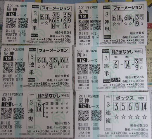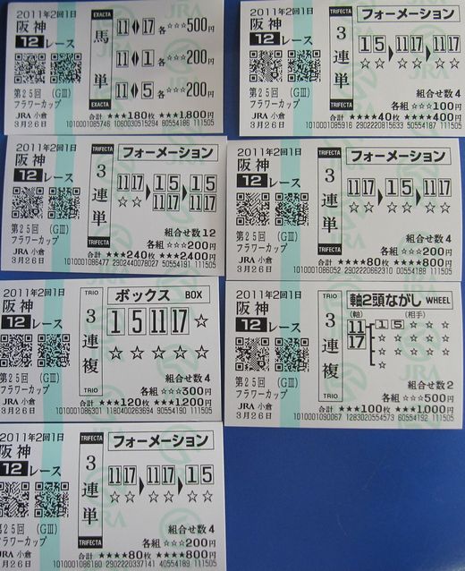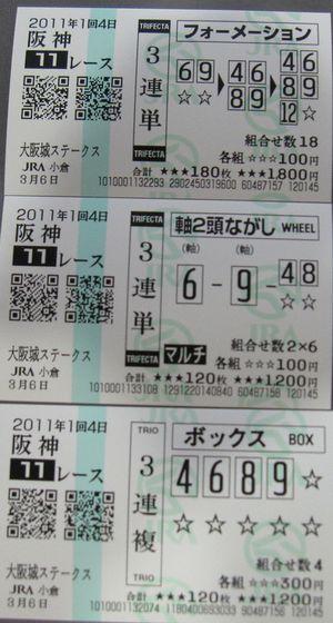 今週の競馬が中止となった。 東北地方太平洋沖地震に関連し、3場とも競馬中止が決定した! 【緊急】3月12日(土)、13日(日)の競馬開催を取り止めます 本日発生しました東北地方太平洋沖地震の影響により、 3月12日(土)、13日(日)の競馬開催(中山・阪神・小倉競馬)を 中止いたしますので、お知らせいたします。 また、JRA全施設における今週の発売・払戻業務も中止いたします。 日本中央競馬会 理事長 土川健之のコメント】 「謹んで災害のお見舞いを申し上げます。 このたびの東北地方太平洋沖地震により、 被災されました皆様に対しまして心からお見舞いを申し上げますとともに、 一日も早く復旧されることをお祈りいたします。」 昨日の夕方には安否確認のメールが来た。 また、土日は連絡が取れるようにしておくよう 部長から指示が出た。 --前日のブログ-- 小倉で注目のハンデキャップ重賞!「第59回 中京記念」の有力馬 勝率で上回る56キロ以上の馬 見逃せない高齢馬の活躍! シャドウゲイト 58kg 田中騎手 9歳 バトルバニヤン 57kg 藤岡騎手 7歳 サンライズマックス 57kg 福永騎手 7歳 ラフォルジュルネ 54kg 田辺騎手 4歳牝馬 ナリタクリスタル 56kg 田中騎手 6歳 この中から優勝馬がでるのかな 明日は小倉競馬場で観戦予定 --前回のブログ-- 「大阪城Sの馬券」ハナ差の勝利 昨日、スポーツ新聞を買い、勝利の余韻に 浸っていたが、レース結果を見ると 4着馬とはハナ差であった。 そんなに際どいとは思いもよらなかった! --前日のブログ--だがこの日は、阪神11Rを当てて大きくプラスとなった。01 阪神 日 11R 3連単フォーメーション 1着:06,09 2着:04,06,08,09 3着:04,06,08,09 各 100円計1,200円 09→06→08 33,170円 33,170円 02 阪神 日 11R 3連単軸2頭ながしマルチ 軸:06,09 04,08 各 100円計1,200円 09→06→08 33,170円 33,170円 03 阪神 日 11R 3連複BOX 04,06,08,09 各 400円計1,600円 06-08-09 5,280円 21,120円 トータル 4,000円 87,460円 単勝5番人気のダンツホウテイ(牡6、栗東・本田)が接戦をモノにして、オープン初勝利を挙げた。道中は5番手を追走。直線半ばで抜け出しにかかると、外からセイクリッドバレーが並び掛けてきたが、最後まで先頭は譲らず首差抑えてゴールした。勝ちタイムは1分45秒7。騎乗した北村友騎手は「レース間隔は空いていたけど、返し馬から雰囲気は良かった。落ち着いていたし、追ってからもスッと反応してくれた。この勝ち方なら次も楽しみ」と話した。 オールアズワンとサダムパテックから 件数 場名 レース 式別 馬組 金額 的中 (1) 中山(日) 11R 3連単 フォーメーション 1着:05,062着:05,063着:04,09,11 各300円(計1,800円) (2) 中山(日) 11R 3連単 フォーメーション 1着:05,062着:04,09,113着:05,06 各200円(計1,200円) (3) 中山(日) 11R 3連複 軸1頭ながし 軸馬:05相手:04,06,09,11 各200円(計1,200円) (4) 中山(日) 11R 3連複 軸2頭ながし 軸馬:05-06相手:04,09,11 各200円(計600円) 購入金額 4,800円 払戻金額 0円 -前回のブログ--土曜日の重賞当たり 先ずはディソール4馬身差圧勝/チューリップ賞 女王レーヴディソール(牝3、栗東・松田博)が単勝1・1倍の断然人気に応えて圧勝、桜花賞へ王手をかけた。阪神JF以来、約3カ月ぶりの実戦はプラス10キロで登場。ゲートはゆったりだったが、道中9番手からラスト150メートルで先頭に立つと、そこから馬なりで流してゴール。1分34秒5で2着ライステラスに4馬身差をつけ、デビューからの連勝を4つに伸ばした。3着はメデタシ。 福永騎手は「スタートも1戦1戦良くなっている。桜花賞に向けてこのまま無事に行ってほしい」と笑顔。同世代では次元が違う。堂々の牝馬3冠候補だ。なお、上位3頭に桜花賞の優先出走権が与えられる。 馬連(8)(10)は230円、馬単(8)(10)は260円、3連複(5)(8)(10)は1680円、3連単(8)(10)(5)は2930円。(1) 阪神(土) 11R 3連単 フォーメーション 1着:082着:103着:01,02,05 各300円(計900円) 的中 (2) 阪神(土) 11R 3連単 フォーメーション 1着:082着:01,02,053着:10 各200円(計600円) (3) 阪神(土) 11R 3連単 フォーメーション 1着:102着:083着:01,02,05 各200円(計600円) (4) 阪神(土) 11R 3連複 軸2頭ながし 軸馬:08-10相手:01,02,05 各300円(計900円) 的中 購入金額 3,000円 払戻金額 13,830円 鉄板のレースだった! こちらも当たった ダッシャーV、重賞2勝目/オーシャンS 強い4歳世代のスプリント路線筆頭格が実力を見せつけた。3番人気ダッシャーゴーゴー(牡4、栗東・安田)が直線抜け出して快勝、重賞2勝目を挙げた。初めての58キロを背負ったが、その影響をみじんも感じさせない走りだった。道中も中団のベストポジションからスムーズに折り合った。落ち着き払った川田騎手の手綱に導かれて、中山の坂を豪快に進出。1分7秒8でゴールして後続の追撃を抑えた。2着には2番人気キンシャサノキセキ、3着には1番人気レッドスパーダが入り、今年のオーシャンSは穏やかな決着となった。 馬連(5)(10)1590円、馬単(5)(10)3210円、3連複(5)(9)(10)1520円、3連単(5)(10)(9)1万80円。 (1) 中山(土) 11R 3連単 フォーメーション 1着:05,102着:03,05,09,103着:03,05,09,10 各100円(計1,200円) 的中 (2) 中山(土) 11R 3連単 軸2頭ながしマルチ 軸馬