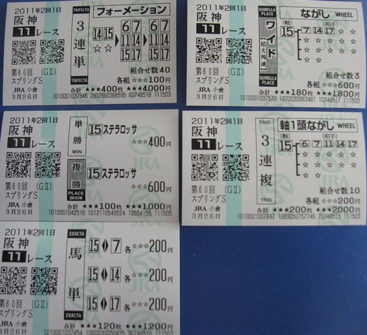 「第60回 スプリングステークス(皐月賞トライアル)」の馬券 直線はじけるように伸びた、ドリームジャーニーの全弟オルフェーヴル(牡3、栗東・池江)が重賞初制覇。兄の届かなかったクラシックへ1歩前進した。 前半は1分を切るくらいの平均ペース。中団でじっくりと脚をためたオルフェーヴルは、直線外から内に切れ込むように先頭に立つと、追いすがるベルシャザールを振り切り、1分46秒4のタイムで快勝した。3着には追い込んだステラロッサが入り、3頭が皐月賞の優先出走権を獲得した。 池添騎手は「掛かる面があるが、今日は折り合いがついていいリズムで走れた。本番につながるレースができて楽しみになったし、ドリームジャーニーの弟じゃなくて、オルフェーヴルと言われるように...」と話していた。 馬連(6)(7)は1420円、馬単(6)(7)は2940円、3連複(6)(7)(15)は6030円、3連単(6)(7)(15)は2万8270円。件数 場名 レース 式別 馬組 金額 的中 (1) 阪神(土) 11R 3連複 06-07-15 200円 的中 (2) 阪神(土) 11R 3連複 06-11-15 200円 (3) 阪神(土) 11R 3連複 06-14-15 200円 (4) 阪神(土) 11R 3連複 06-15-17 200円 (5) 阪神(土) 11R 3連複 07-11-15 200円 (6) 阪神(土) 11R 3連複 07-14-15 200円 (7) 阪神(土) 11R 3連複 07-15-17 200円 (8) 阪神(土) 11R 3連複 11-14-15 200円 (9) 阪神(土) 11R 3連複 11-15-17 200円 (10) 阪神(土) 11R 3連複 14-15-17 200円 (11) 阪神(土) 11R 馬 連 06-15 400円 (12) 阪神(土) 11R 馬 連 07-15 400円 (13) 阪神(土) 11R 馬 連 11-15 400円 (14) 阪神(土) 11R 馬 連 14-15 400円 (15) 阪神(土) 11R 馬 連 15-17 400円 購入金額 4,000円 払戻金額 12,060円 件数 場名 レース 式別 馬組 金額 的中 (1) 阪神(土) 11R 3連単 14→06→07 100円 (2) 阪神(土) 11R 3連単 14→06→11 100円 (3) 阪神(土) 11R 3連単 14→06→15 100円 (4) 阪神(土) 11R 3連単 14→06→17 100円 (5) 阪神(土) 11R 3連単 14→07→06 100円 (6) 阪神(土) 11R 3連単 14→07→11 100円 (7) 阪神(土) 11R 3連単 14→07→15 100円 (8) 阪神(土) 11R 3連単 14→07→17 100円 (9) 阪神(土) 11R 3連単 14→11→06 100円 (10) 阪神(土) 11R 3連単 14→11→07 100円 (11) 阪神(土) 11R 3連単 14→11→15 100円 (12) 阪神(土) 11R 3連単 14→11→17 100円 (13) 阪神(土) 11R 3連単 14→15→06 100円 (14) 阪神(土) 11R 3連単 14→15→07 100円 (15) 阪神(土) 11R 3連単 14→15→11 100円 (16) 阪神(土) 11R 3連単 14→15→17 100円 (17) 阪神(土) 11R 3連単 14→17→06 100円 (18) 阪神(土) 11R 3連単 14→17→07 100円 (19) 阪神(土) 11R 3連単 14→17→11 100円 (20) 阪神(土) 11R 3連単 14→17→15 100円 (21) 阪神(土) 11R 3連単 15→06→07 100円 (22) 阪神(土) 11R 3連単 15→06→11 100円 (23) 阪神(土) 11R 3連単 15→06→14 100円 (24) 阪神(土) 11R 3連単 15→06→17 100円 (25) 阪神(土) 11R 3連単 15→07→06 100円 (26) 阪神(土) 11R 3連単 15→07→11 100円 (27) 阪神(土) 11R 3連単 15→07→14 100円 (28) 阪神(土) 11R 3連単 15→07→17 100円 (29) 阪神(土) 11R 3連単 15→11→06 100円 (30) 阪神(土) 11R 3連単 15→11→07 100円 (31) 阪神(土) 11R 3連単 15→11→14 100円 (32) 阪神(土) 11R 3連単 15→11→17 100円 (33) 阪神(土) 11R 3連単 15→14→06 100円 (34) 阪神(土) 11R 3連単 15→14→07 100円 (35) 阪神(土) 11R 3連単 15→14→11 100円 (36) 阪神(土) 11R 3連単 15→14→17 100円 (37) 阪神(土) 11R 3連単 15→17→06 100円 (38) 阪神(土) 11R 3連単 15→17→07 100円 (39) 阪神(土) 11R 3連単 15→17→11 100円 (40) 阪神(土) 11R 3連単 15→17→14 100円 購入金額 4,000円 払戻金額 0円 --前回のブログ--「第60回 スプリングステークス(皐月賞トライアル)」の有力馬情報 グランプリボス昨年暮れに行われた前走の朝日杯フューチュリティSは、5番人気での優勝。前哨戦の京王杯2歳Sを快勝しながら評価が低かったのは、好位からズルズルと後退して7着に大敗した3走前のデイリー杯2歳Sの内容と、父がスプリント色の濃いサクラバクシンオーという血統面から、芝1600mの適性を疑問視されたためだろう。朝日杯フューチュリティSの勝利でその懸念を払拭し、次なる課題はクラシックの舞台となる芝2000m以上の距離に対応できるかどうか。芝1800mの今回は、今後の路線を左右する重要な一戦となる。 リベルタス小柄だった父ディープインパクトとは異なり、500キロ近い雄大な馬格の持ち主。メイクデビュー阪神(芝1800m、1着)、2戦目となった500万下の黄菊賞(京都・芝1800m、2着)の頃は、まだ体を持て余している印象だったが、さすがは良血馬。レース経験を積むごとに動きが鋭くなり、確実な進歩を遂げている。前走オープン特別の若駒S(京都・芝2000m)は、人気馬3頭の追い比べからグイッとクビ差抜け出る味な勝ち方。好位で折り合えて、勝負強さもあるだけに、大きく崩れるシーンは想像しにくい。リフトザウイングス馬体重530キロで臨んだメイクデビュー阪神(芝1800m)は、1番人気に支持されたものの4着に敗退。2戦目の未勝利(京都・芝2000m)を524キロで快勝し、3戦目の東京スポーツ杯2歳Sは、さらに14キロ減の510キロで強敵相手に2着。体が絞れるとともに、明らかに切れ味が増してきている。前走の朝日杯フューチュリティS(5着)も、4コーナー11番手から追い上げてゴール前で鋭い伸びを見せたが、結果的に中山・芝1600mは距離不足だった印象。200m延びる今回は、V争