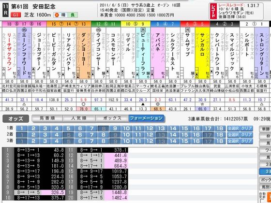 「第61回 安田記念)」 私の予想は外れ ディープインパクト産駒の3歳馬リアルインパクト(牡、堀)が単勝9番人気の 低評価を覆し、好位から押し切る磐石のレースで古馬撃破と G1初制覇を果たした。勝ち時計は1分32秒0。 首差の2着にストロングリターン、3着にスマイルジャックが入り、 1番人気に推された5冠牝馬アパパネは6着に敗れた。 馬連(1)(14)1万2270円、馬単(14)(1)2万5810円、3連複(1)(3)(14)4万4090円、3連単(14)(1)(3)33万5600円。 私の馬券 件数 場名 レース 式別 馬組 金額 (1) 東京(日) 11R 3連複 軸1頭ながし 軸馬:08相手:01,05,09,13,17 各200円(計2,000円) (2) 東京(日) 11R 3連複 軸2頭ながし 軸馬:08-13相手:01,05,09,17 各300円(計1,200円) (3) 東京(日) 11R 3連複 軸2頭ながし 軸馬:08-09相手:01,05,13,17 各300円(計1,200円) (4) 東京(日) 11R 3連単 軸2頭ながしマルチ 軸馬:08,13相手:01,05,09,17 各100円(計2,400円) (5) 東京(日) 11R 3連単 軸2頭ながしマルチ 軸馬:08,09相手:01,05,13,17 各100円(計2,400円) (6) 東京(日) 11R ワイド ながし 軸馬:09相手:08,13 各400円(計800円) 合計 10,000円 ついでにWIN5の馬券 数 阪神 10R 東京 10R 新潟 11R 阪神 11R 東京 11R 組数 金額 (1) 04, 07 07, 09 03, 06 04, 08 08, 09, 13 48組 各100円(計4,800円) (2) 04, 07 09 03, 06 04, 08, 09 08 12組 各100円(計1,200円) 合計金額 6,000円 ブログランキングに参加しています。 記事にビビっときたらワンクリックお願いします!♪ にほんブログ村!!アダルトトラックバックやコメントはやめてください!!