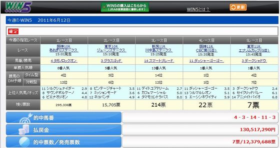 WIN5の私の馬券 は外れ 的中馬券 4 - 3 - 14 - 11 - 3 8番人気-5番人気-13番人気-1番人気-1番人気 払戻し金 130,517,290円 的中 票数 7票/12,379,688票 件数 阪神 10R 東京 10R 新潟 11R 阪神 11R 東京 11R 組数 金額 的中 06, 11 07, 08 11 07, 11 02, 03, 11 24組 各100円(計2,400円) 購入金額 2,400円 払戻金額 0円 --先週のレース結果-- 「第61回 安田記念)」 私の予想は外れ ディープインパクト産駒の3歳馬リアルインパクト(牡、堀)が単勝9番人気の 低評価を覆し、好位から押し切る磐石のレースで古馬撃破と G1初制覇を果たした。勝ち時計は1分32秒0。 首差の2着にストロングリターン、3着にスマイルジャックが入り、 1番人気に推された5冠牝馬アパパネは6着に敗れた。 馬連(1)(14)1万2270円、馬単(14)(1)2万5810円、3連複(1)(3)(14)4万4090円、3連単(14)(1)(3)33万5600円。 私の馬券 件数 場名 レース 式別 馬組 金額 (1) 東京(日) 11R 3連複 軸1頭ながし 軸馬:08相手:01,05,09,13,17 各200円(計2,000円) (2) 東京(日) 11R 3連複 軸2頭ながし 軸馬:08-13相手:01,05,09,17 各300円(計1,200円) (3) 東京(日) 11R 3連複 軸2頭ながし 軸馬:08-09相手:01,05,13,17 各300円(計1,200円) (4) 東京(日) 11R 3連単 軸2頭ながしマルチ 軸馬:08,13相手:01,05,09,17 各100円(計2,400円) (5) 東京(日) 11R 3連単 軸2頭ながしマルチ 軸馬:08,09相手:01,05,13,17 各100円(計2,400円) (6) 東京(日) 11R ワイド ながし 軸馬:09相手:08,13 各400円(計800円) 合計 10,000円 ついでにWIN5の馬券 数 阪神 10R 東京 10R 新潟 11R 阪神 11R 東京 11R 組数 金額 (1) 04, 07 07, 09 03, 06 04, 08 08, 09, 13 48組 各100円(計4,800円) (2) 04, 07 09 03, 06 04, 08, 09 08 12組 各100円(計1,200円) 合計金額 6,000円 ブログランキングに参加しています。 記事にビビっときたらワンクリックお願いします!♪ にほんブログ村!!アダルトトラックバックやコメントはやめてください!!