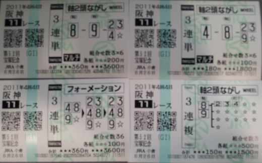 今日は阪神・中山のメーンレースを当てた! 久しぶり (1) 阪神(土) 11R 3連複 BOX 03,08,11,12 各200円(計800円) 的中 (2) 阪神(土) 11R 3連単 フォーメーション 1着:03,082着:03,08,11,123着:03,08,11,12 各100円(計1,200円) 的中 購入金額 2,000円 払戻金額 24,610円 件数 場名 レース 式別 馬組 金額 的中 (1) 中山(土) 11R 3連単 フォーメーション 1着:01,102着:01,103着:02,05 各300円(計1,200円) 的中 (2) 中山(土) 11R 3連単 フォーメーション 1着:01,102着:02,053着:01,10 各200円(計800円) 購入金額 2,000円 払戻金額 6,780円 当たりはプールの駐車場でTV観戦 残念ながら12Rは両方とも外れ 明日もWIN5に挑戦 ---前回のWIN5--- WIN5の私の馬券 は外れ 的中馬券 4 - 3 - 14 - 11 - 3 8番人気-5番人気-13番人気-1番人気-1番人気 払戻し金 130,517,290円 的中 票数 7票/12,379,688票 件数 阪神 10R 東京 10R 新潟 11R 阪神 11R 東京 11R 組数 金額 的中 06, 11 07, 08 11 07, 11 02, 03, 11 24組 各100円(計2,400円) 購入金額 2,400円 払戻金額 0円 --先週のレース結果-- 「第61回 安田記念)」 私の予想は外れ ディープインパクト産駒の3歳馬リアルインパクト(牡、堀)が単勝9番人気の 低評価を覆し、好位から押し切る磐石のレースで古馬撃破と G1初制覇を果たした。勝ち時計は1分32秒0。 首差の2着にストロングリターン、3着にスマイルジャックが入り、 1番人気に推された5冠牝馬アパパネは6着に敗れた。 馬連(1)(14)1万2270円、馬単(14)(1)2万5810円、3連複(1)(3)(14)4万4090円、3連単(14)(1)(3)33万5600円。 私の馬券 件数 場名 レース 式別 馬組 金額 (1) 東京(日) 11R 3連複 軸1頭ながし 軸馬:08相手:01,05,09,13,17 各200円(計2,000円) (2) 東京(日) 11R 3連複 軸2頭ながし 軸馬:08-13相手:01,05,09,17 各300円(計1,200円) (3) 東京(日) 11R 3連複 軸2頭ながし 軸馬:08-09相手:01,05,13,17 各300円(計1,200円) (4) 東京(日) 11R 3連単 軸2頭ながしマルチ 軸馬:08,13相手:01,05,09,17 各100円(計2,400円) (5) 東京(日) 11R 3連単 軸2頭ながしマルチ 軸馬:08,09相手:01,05,13,17 各100円(計2,400円) (6) 東京(日) 11R ワイド ながし 軸馬:09相手:08,13 各400円(計800円) 合計 10,000円 ついでにWIN5の馬券 数 阪神 10R 東京 10R 新潟 11R 阪神 11R 東京 11R 組数 金額 (1) 04, 07 07, 09 03, 06 04, 08 08, 09, 13 48組 各100円(計4,800円) (2) 04, 07 09 03, 06 04, 08, 09 08 12組 各100円(計1,200円) 合計金額 6,000円 ブログランキングに参加しています。 記事にビビっときたらワンクリックお願いします!♪ にほんブログ村!!アダルトトラックバックやコメントはやめてください!!