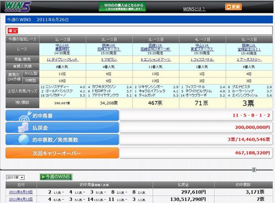 WIN5に初めてキャリーオーバー 初めて上限の2億円 3枚 次回キャリーオーバー 4億6700万円! ---前日のブログ-- 春の総決算 第52回宝塚記念 の私の馬券は惜しかった! 軸馬をローズキングダム これが4着 逆に3着になればと ブエナビスタを負かすのはローズキングダム とエイシンフラッシュ の2頭で3連単マルチ PATは外れたが、馬券は当たり 2番手を進んだ6番人気のアーネストリー(牡6、佐々木)が4角先頭から押し切り、2分10秒1のレコードでG1初制覇を達成した。殊勲の佐藤哲三騎手は「強かったと思います。下が緩かったし心配もあったが、いつもの感じなら大丈夫だと思っていた。イメージ通りの調教ができた時は、イメージ通りの結果が出ていたので」と笑顔で振り返った。 1番人気ブエナビスタは中団後方から追い込み1馬身半差の2着。勝ち馬に迫るまではいかなかったが、エイシンフラッシュを鼻差かわして女王の意地を見せた。 馬連(2)(8)1660円 6人気、馬単(2)(8)4740円 18人気、3連複(2)(4)(8)2020円 4人気、3連単(2)(8)(4)1万7480円 50人気。 --昼のブログ-- 春の総決算 第52回宝塚記念 の私の馬券 1) 阪神(日) 11R 3連単 フォーメーション 1着:04,08,092着:02,03,04,08,093着:02,03,04,08,09 各100円(計3,600円) (2) 阪神(日) 11R 3連単 フォーメーション 1着:04,092着:083着:02,03,04,08,09 各100円(計600円) (3) 阪神(日) 11R 3連単 フォーメーション 1着:082着:04,093着:02,03,04,09 各200円(計1,200円) (4) 阪神(日) 11R 3連複 軸2頭ながし 軸馬:08-09相手:02,03,04 各500円(計1,500円) 合計金額 6,900円 WIN5予想1件目中山10R:02,16阪神10R:04,06函館11R:02,06中山11R:01,05阪神11R:04,08,09各100円(合計:4,800円) --朝のブログ-- 春の総決算 第52回宝塚記念 の人気馬 ブエナビスタ(4枠8番 岩田騎手)1番人気 3.2倍 ヴィクトリアマイル2着 G1 5勝 ルーラーシップ(2枠3番 横山騎手)2番人気 3.9倍 父キングカメハメハ、母エアグルーヴという指折りの良血馬 金鯱賞優勝 エイシンフラッシュ(2枠4番 安藤騎手)3番人気 5.2倍 前走の天皇賞(春)は、優勝馬ヒルノダムールから半馬身差の2着 トゥザグローリー(7枠14番 福永騎手)4番人気 7.8倍 ローズキングダム(5枠9番 ウィリアムズ騎手)5番人気 11.9倍 ブエナビスタの1位入線2着降着があったとはいえ、3歳でジャパンカップのタイトルを取った実力馬 良馬場が望ましい アーネストリー(1枠2番 佐藤騎手)6番人気 13.3倍 ナムラクレセント(1枠1番 和田騎手)7番人気 19.2倍 前走の天皇賞(春)は、優勝馬ヒルノダムールから0.3秒差の3着 --前回のブログ-- 春の総決算 第52回宝塚記念 いよいよ日曜日にある。 ブエナビスタかルーラーシップか ブエナビスタ:G16勝目を狙う ルーラーシップ:最強世代の遅れてきた良血馬(金鯱賞優勝馬) 珍しく金曜日にニッカンスポーツを購入した。 じっくり検討して当てたい! ブログランキングに参加しています。 記事にビビっときたらワンクリックお願いします!♪ にほんブログ村!!アダルトトラックバックやコメントはやめてください!!