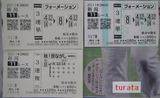 久々の当たり馬券(7/31 新潟11R) WIN5では1点買いしたが、3連単のフォーカスでは 2着も考慮これが見事当たり この日はカメラを携帯していなかったので1枚10円で複製 儲かった分は小倉。新潟の12Rですってしまったが 久しぶりの当たりが気持ち良かった。 --前日のブログ-- 今週のWIN5 私の馬券 (7/31) WIN3で終了 1件目小倉10R:10,12,13 10 3番人気新潟10R:02,08 1番人気函館11R:07 07 1番人気小倉11R:02,04,08 17 4番人気新潟11R:08 14 5番人気 --先週の結果-- 今週のWIN5 私の馬券 (7/24) 4R的中 最後が駄目 京都10R:03,16 16(1番人気 280円)新潟10R:02,06 02(1番人気 140円)函館11R:04,12,16 04(4番人気 760円)京都11R:03,04 04(1番人気 280円)新潟11R:03,04 07(15番人気 34,300円)各100円 今回は4R的中したので、最後のレースをドキドキして見たが、 残念な結果となった。 配当 ブログランキングに参加しています。 記事にビビっときたらワンクリックお願いします!♪ にほんブログ村!!アダルトトラックバックやコメントはやめてください!!