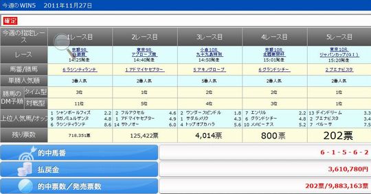 win5 ジャパンC 私の馬券は外れ 京都9R以外当たっていたのに 京都9R:01,17 06(3番人気)8.6倍東京9R:01,13 01(2番人気4.9倍小倉10R:02,05 05(5番人気)14.8倍京都10R:06,07 06(2番人気)4.8倍東京10R:02,13,14 02(2番人気)3.4倍 各100円 (合計:4,800円) (1) 東京(日) 10R 3連単 軸2頭ながしマルチ 軸馬:13,02相手:07,12,14,15,16 各100円(計3,000円) (2) 東京(日) 10R 3連単 軸2頭ながしマルチ 軸馬:14,02相手:07,12,13,15,16 各100円(計3,000円) (3) 東京(日) 10R 3連複 軸2頭ながし 軸馬:02-13相手:07,12,14,15,16 各500円(計2,500円) (4) 東京(日) 10R 3連複 軸2頭ながし 軸馬:02-14相手:07,12,13,15,16 各500円(計2,500円) (5) 東京(日) 10R 馬 連 ながし 軸馬:14相手:02,13 各500円(計1,000円) 合計 12,000円 --朝のブログ--凱旋門賞馬は勝てるのか 早い日本の馬場に適応すると判断し、◎に ジャパンCの前日売り最終オッズは、 単勝1番人気が13番デインドリームの3・2倍。 次いで2番ブエナビスタが3・7倍、 7番ペルーサが9・0倍で続いている。 馬連は(2)(13)6・9倍、 馬単は(13)(2)が12・1倍、 3連複は(2)(7)(13)14・6倍が票を集めている。 3連単は(13)(2)(7)が45・4倍で1番人気となっている。 いまから日刊スポーツを買いに散歩 ブログランキングに参加しています。 記事にビビっときたらワンクリックお願いします!♪ にほんブログ村!!アダルトトラックバックやコメントはやめてください!!