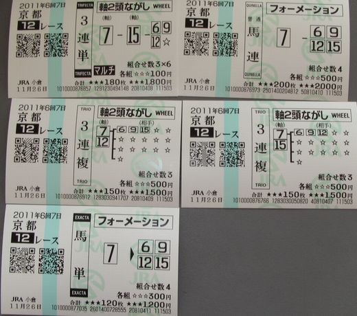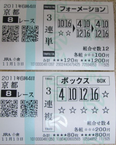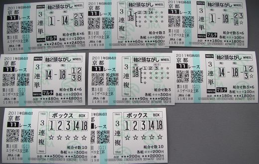 京都8R当たり 残念なのは小倉競馬場で買った馬券が12と13を間違え外れ 件数 場名 レース 式別 馬組 金額 的中 (1) 京都(日) 8R 3連複 BOX 04,10,13,16 各200円(計800円) 的中 (2) 京都(日) 8R 3連単 フォーメーション 1着:10,162着:04,10,13,163着:04,10,13,16 各100円(計1,200円) 的中 (3) 京都(日) 9R 3連複 BOX 01,03,06,10 各200円(計800円) (4) 京都(日) 9R 3連単 フォーメーション 1着:03,062着:01,03,06,103着:01,03,06,10 各100円(計1,200円) 購入金額 4,000円 払戻金額 7,660円 私のWIN5(11/13) 馬券 新潟11Rは一点買い WIN3まで勝利すると当たるかも エリザベス女王杯は四点買い 東京10R:01,13京都10R:03,07新潟11R:13東京11R:12,13京都11R:01,03,14,18各100円 (合計:3,200円) エリザベス女王杯の私の馬券 件数 場名 レース 式別 馬組 金額 (1) 京都(日) 11R 3連単 軸2頭ながしマルチ 軸馬:14,18相手:01,02,03 各100円(計1,800円) (2) 京都(日) 11R 3連複 BOX 01,02,03,14,18 各200円(計2,000円) 合計 3,800円 エリザベス女王杯 ブログランキングに参加しています。 記事にビビっときたらワンクリックお願いします!♪ にほんブログ村!!アダルトトラックバックやコメントはやめてください!!