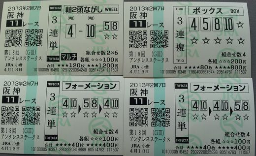 こんばんは。 今日の思永中学校温水プールは空いていました。 今日の競馬はトントン (1) 阪神(土) 11R 3連単 軸2頭ながしマルチ 軸馬:04,10相手:05,08 各100円(計1,200円) 的中 (2) 阪神(土) 11R 3連複 BOX 04,05,08,10 各200円(計800円) 的中 (3) 阪神(土) 11R ワイド ながし 軸馬:05相手:04,08,10 各400円(計1,200円) (4) 阪神(土) 11R 馬 連 ながし 軸馬:05 相手:04,08,10 各200円(計600円) (5) 阪神(土) 11R 複 勝 05 200円 購入金額 4,000円 払戻金額 6,070円 この当たり馬券で追加したのG当たりトントン (1) 中山(土) 12R 3連複 BOX 01,06,13,16 各300円(計1,200円) 的中 (2) 中山(土) 12R 3連単 フォーメーション 1着:06,132着:01,06,13,163着:01,06,13,16 各100円(計1,200円) 的中 (3) 中山(土) 12R 馬 連 ながし 軸馬:13相手:01,06 各300円(計600円) 購入金額 3,000円 払戻金額 12,400円 明日も素適な1日となりますように ブログランキングに参加しています。 記事にビビっときたらワンクリックお願いします!♪ にほんブログ村!!アダルトトラックバックやコメントはやめてください!!