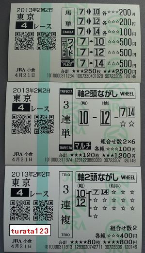 こんにちは、 昨日の雨のため、南蔵院行きは延期 午前中、小倉競馬場へ 20130421_114652 東京4R 快心の当たり馬券 馬単・ワイド・3連単・3連複が当たりました。 20130421_111612 東京3R 3連単・3連複が当たりました。 20130421_104619 東京2R 3連複が当たりました。 20130421_103639 京都2R 馬連が当たりました。 4レース続けて当たるのは初めてです。 今日も素適な1日となりますように ブログランキングに参加しています。 記事にビビっときたらワンクリックお願いします!♪ にほんブログ村!!アダルトトラックバックやコメントはやめてください!!