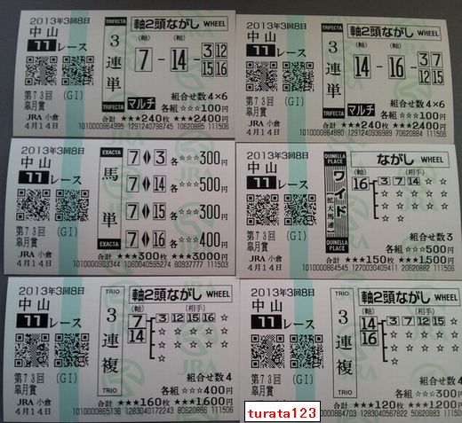 こんにちは。 WIN5と皐月賞馬券 阪神10R:01,09中山10R:04,09福島11R:06阪神11R:11,16中山11R:07,14,16各100円 (合計:2,400円) 皐月賞は混戦の為、軸馬2頭で流します。 1) 中山(日) 11R 3連単 軸2頭ながしマルチ 軸馬:07,14相手:03,12,15,16 各100円(計2,400円) (2) 中山(日) 11R 3連単 軸2頭ながしマルチ 軸馬:14,16相手:03,07,12,15 各100円(計2,400円) (3) 中山(日) 11R 3連複 軸2頭ながし 軸馬:07-14相手:03,12,15,16 各400円(計1,600円) (4) 中山(日) 11R 3連複 軸2頭ながし 軸馬:14-16相手:03,07,12,15 各300円(計1,200円) (5) 中山(日) 11R ワイド ながし 軸馬:16相手:03,07,14 各500円(計1,500円) 購入金額 9,100円 今日も素適な1日となりますように ブログランキングに参加しています。 記事にビビっときたらワンクリックお願いします!♪ にほんブログ村!!アダルトトラックバックやコメントはやめてください!!