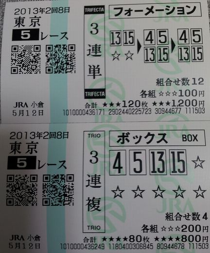 おはようございます。 小倉は曇り 武豊騎手が「キズナ」で8年ぶりのダービージョッキーに 今日のWIN5と日本ダービー馬券 ダービー5勝目という金字塔を 凄いですね。 ーーー前日のブログーーー WIN5 東京8R:04,16 京都9R:14東京9R:04,06京都10R:02,18東京10R:01,07,08 各100円(合計:2,400円) (1) 東京(日) 10R 3連複 軸2頭ながし 軸馬:07-08相手:01,02,09 各400円(計1,200円) (2) 東京(日) 10R 3連単 軸2頭ながしマルチ 軸馬:08,07相手:01,02,09 各100円(計1,800円) (3) 東京(日) 10R 3連単 フォーメーション 1着:07,082着:07,083着:01,02,09 各100円(計600円) (4) 東京(日) 10R 3連単 フォーメーション 1着:07,082着:01,02,093着:07,08 各100円(計600円) (5) 東京(日) 10R 馬 単 軸1頭ながしマルチ 軸馬:07相手:01,08 各200円(計800円) 合計 5,000円 ブログランキングに参加しています。 記事にビビっときたらワンクリックお願いします!♪ にほんブログ村!!アダルトトラックバックやコメントはやめてください!!