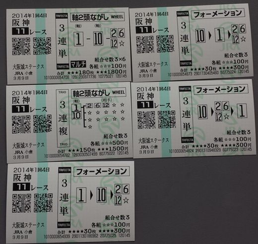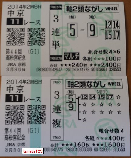 こんにちは。京都は雨があがり曇りです。 高松宮記念が当たりました。 淀競馬場に行った甲斐がありました。 (1) 中京(日) 11R 3連単 軸2頭ながしマルチ 軸馬:05,09相手:12,14,17,18 各100円(計2,400円) 的中 (2) 中京(日) 11R 3連複 軸2頭ながし 軸馬:05-09相手:12,14,17,18 各400円(計1,600円) 的中 購入金額 4,000円 払戻金額 103,000円 久々に会心の当たりでした。 明日は醍醐寺の桜を見に行きます 今日も素適な1日となりますように ブログランキングに参加しています。 記事にビビっときたらワンクリックお願いします!♪