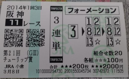 こんにちは。小倉は晴れていますチューリップ賞は1番人気のハープスターを信じて勝負 (1) 阪神(土) 11R 3連単 フォーメーション 1着:032着:01,02,08,12,133着:01,02,08,12,13 各100円(計2,000円) 購入金額 2,000円 今日も素適な1日となりますように ブログランキングに参加しています。 記事にビビっときたらワンクリックお願いします!♪