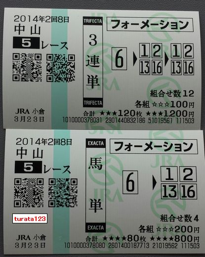 こんにちは。今日の初当たり、中山5R (1) 中山(日) 5R 3連単 フォーメーション 1着:062着:01,02,133着:01,02,13,16 各200円(計1,800円) 的中 (2) 中山(日) 5R 単 勝 06 200円 的中 購入金額 2,000円 払戻金額 6,680円 IPATの通りに買えばと悔やまれます。 今日も素適な1日となりますように ブログランキングに参加しています。 記事にビビっときたらワンクリックお願いします!♪