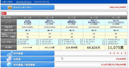 おはようございます。 小倉は星が瞬いています。昨日のWIN5が惜しかった! WIN2で撃沈 後は当たっていました。 中山9R:05阪神10R:09中山10R:05,10阪神11R:01,02,06中山11R:02,03各100円 (合計:1,200円) 20140323 メーンの重賞は久しぶりに当たり (1) 中山(日) 11R 3連単 フォーメーション 1着:02,032着:02,03,04,10,153着:02,03,04,10,15 各100円(計2,400円) 的中 (2) 中山(日) 11R 馬 連 ながし 軸馬:02 相手:03,04,10,15 各400円(計1,600円) 的中 購入金額 4,000円 払戻金額 13,410円 阪神12Rも当たりました。 (1) 阪神(日) 12R 3連単 フォーメーション 1着:10,122着:07,10,12,143着:07,10,12,14 各100円(計1,200円) 的中 (2) 阪神(日) 12R 3連複 BOX 07,10,12,14 各200円(計800円) 的中 購入金額 2,000円 払戻金額 12,440円 今日も素適な1日となりますように ブログランキングに参加しています。 記事にビビっときたらワンクリックお願いします!♪
