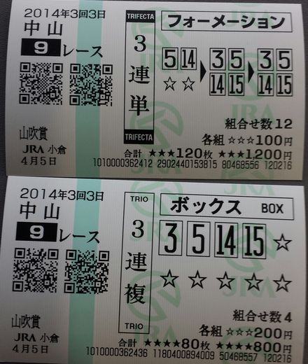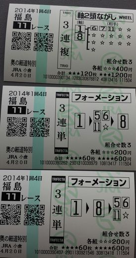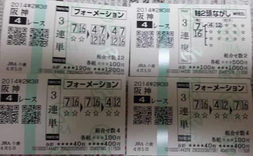 おはようございます。小倉は晴れています 昨日の競馬はトントン 阪神4R・中山9R・阪神10Rが当たりましたが、11R、12Rが外れ (1) 中山(土) 9R 3連単 フォーメーション 1着:05,142着:03,05,14,153着:03,05,14,15 各100円(計1,200円) 的中 (2) 中山(土) 9R 3連複 BOX 03,05,14,15 各200円(計800円) 的中 (3) 中山(土) 9R 馬 連 ながし 軸馬:14相手:03,05,15 各500円(計1,500円) 購入金額 3,500円 払戻金額 17,380円 20140405_144051-1 中山9R (1) 阪神(土) 10R 3連単 フォーメーション 1着:02,082着:02,083着:03,10 各300円(計1,200円) 的中 (2) 阪神(土) 10R 3連単 フォーメーション 1着:02,082着:03,103着:02,08 各200円(計800円) 的中 (3) 阪神(土) 10R 3連複 軸2頭ながし 軸馬:02-08相手:03,10 各500円(計1,000円) 的中 購入金額 3,000円 払戻金額 6,970円 20140405_150651-1 阪神10R 2・3着が同着 今日もしっかり予想したいですね 今日も素適な1日となりますように ブログランキングに参加しています。 記事にビビっときたらワンクリックお願いします!♪