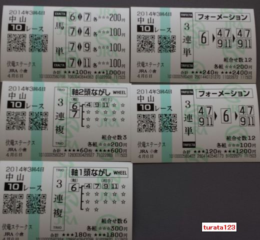 おはようございます。小倉は晴れています 昨日の競馬は中山10Rのみ当たり(トホホ) 01 中山 日 10R 3連単フォーメーション 1着:06 2着:04,07,09,11 3着:04,07,09,11 各 100円計1,200円 - - 0円 02 中山 日 10R 3連単フォーメーション 1着:04,07,09,11 2着:06 3着:04,07,09,11 各 100円計1,200円 - - 0円 03 中山 日 10R 3連複軸2頭ながし 軸:06,07 04,09,11 各200円計600円 - - 0円 04 中山 日 10R 馬連 06-07 200円 06-07 5,180円 10,360円 合計 3,200円 10,360円 20140406_151503-1 20140406 中山10R 今日も素適な1日となりますように ブログランキングに参加しています。 記事にビビっときたらワンクリックお願いします!♪